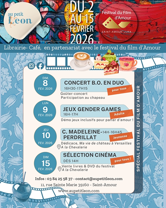 Voor uw gastronomische intermezzo's verwelkomt de boekhandel café au petit Léon in Saint-Amour u tijdens het hele Love Film Festival.