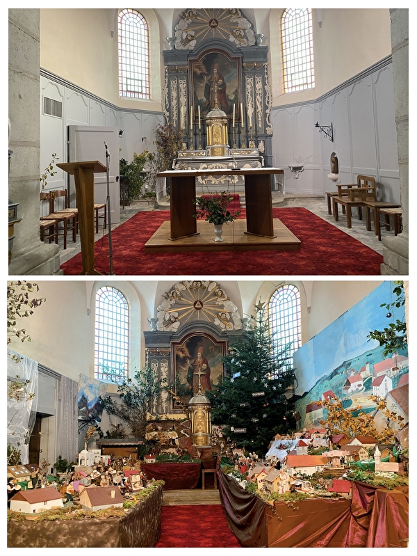 Elke dag tentoonstelling van een geanimeerde kerststal. gratis toegang, 2 euromunt voor het mechanisme, geanimeerde kerstmannen uit de ambachten van weleer, reconstructie van het dorp in miniatuur, animeo kerststal.