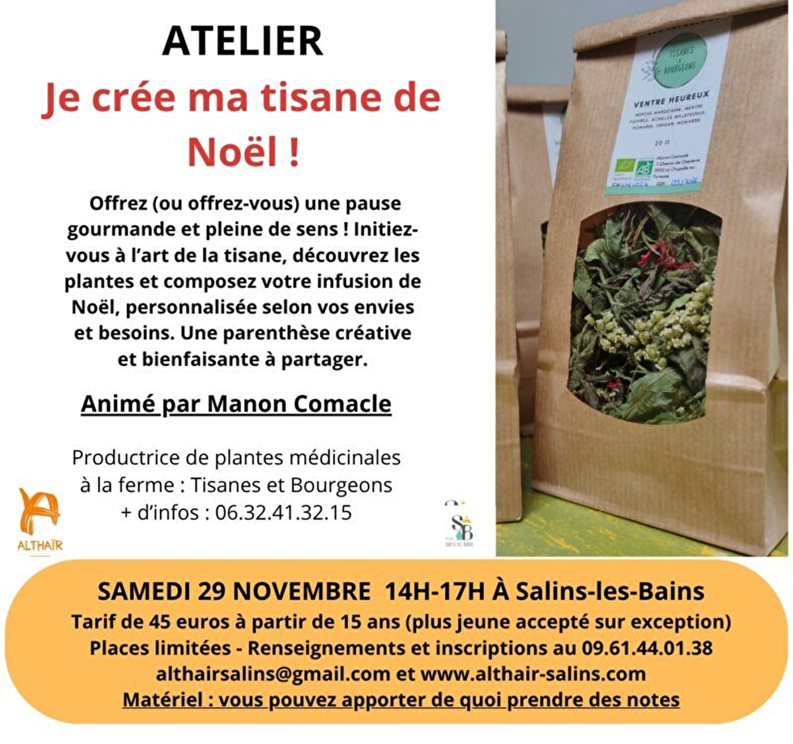 Trakteer jezelf (of iemand anders) op een gastronomische pauze vol zin! Maak kennis met de kunst van kruidenthee, ontdek de planten en maak je eigen kerstinfusie, gepersonaliseerd naar jouw behoeften en verlangens. Een creatief en weldadig intermezzo om te delen.