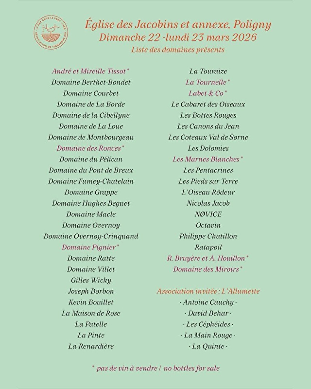 Wijnliefhebbers krijgen de kans om een reeks biologische wijnen uit de Jura te proeven, rechtstreeks met de wijnmakers te praten en hun producten tegen de beste prijzen te kopen in een prachtige omgeving in het hart van de wijngaarden van de Jura. Biologische catering zal ter plaatse beschikbaar zijn.