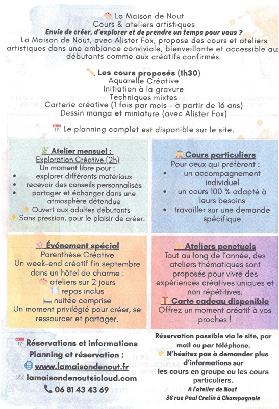 La Maison de Nout, met Alister Fox, biedt kunstlessen en workshops in een vriendelijke, ondersteunende sfeer, toegankelijk voor zowel beginners als ervaren kunstenaars.