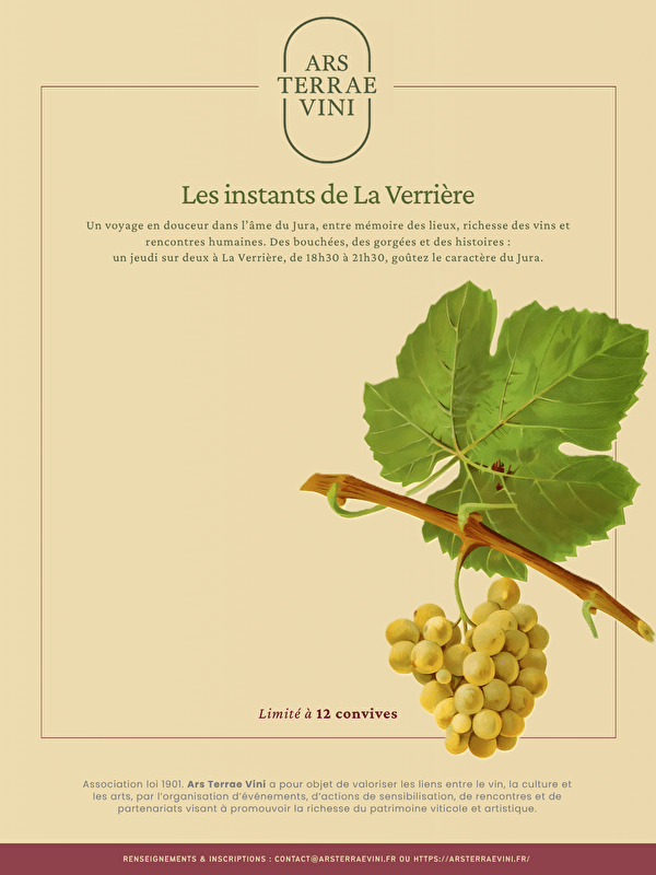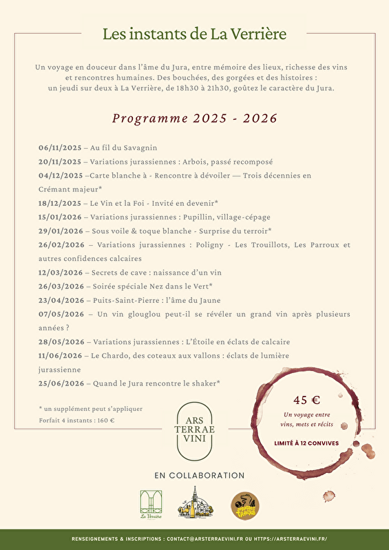 Les Instants de La Verrière is een reeks evenementen georganiseerd door Ars Terrae Vini, waar je om de andere donderdag het karakter van de Jura kunt proeven, met een mix van wijn, eten en verhalen.