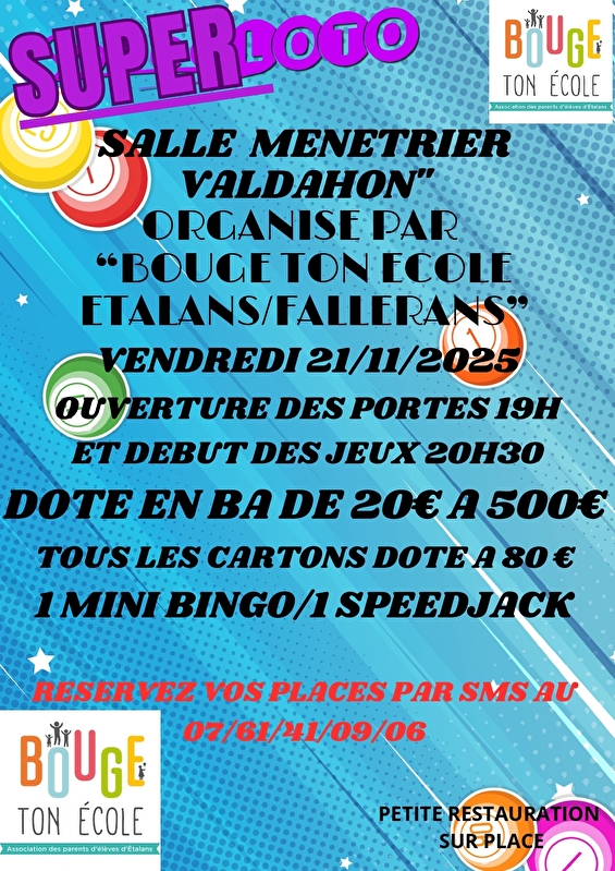 Lotto georganiseerd door SpeedLoto voor de oudervereniging van de Étalans / Fallerans school - De deuren gaan open om 19.00 uur - de wedstrijden beginnen om 20.30 uur. Reserveren aanbevolen per sms