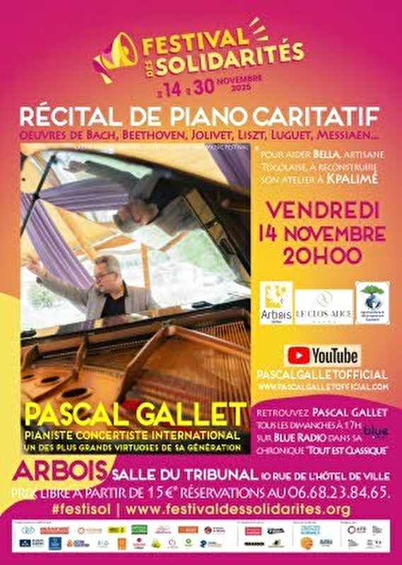 Georganiseerd door de internationale solidariteitsvereniging ADE France (Salins les Bains), die kleine producenten en verwerkers in de koffie- en cacao-industrie in Togo steunt. In aanwezigheid van Bella KPODZRO, Togolese chocolademaker en hoofd van de coöperatie in Togo, aan wie het concert is opgedragen. Alle opbrengsten van het concert gaan naar de aankoop van apparatuur voor Denyigba Cacao, de traditionele chocoladefabriek van Togo, die eind 2024 volledig door brand werd verwoest. Werken van Bach, Beethoven, Liszt, Luguet, Messiaen, Jolivet, Hai
