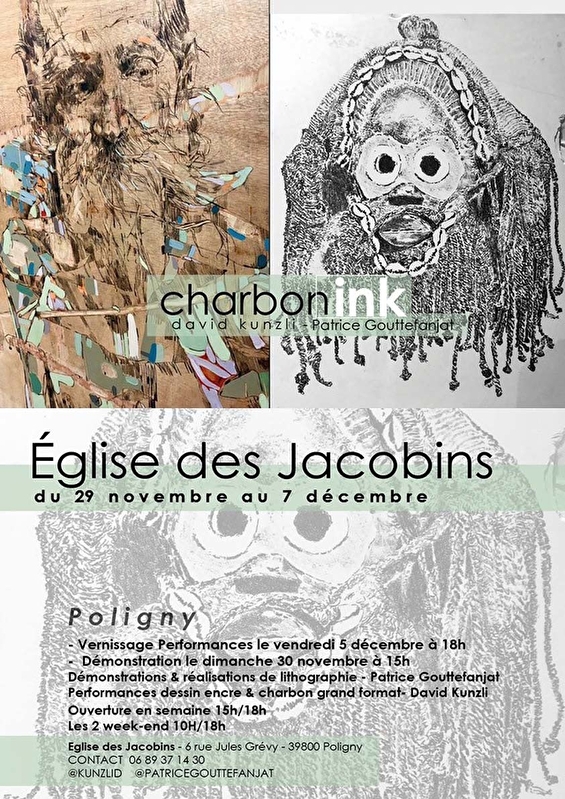 Lithografie demonstraties en creaties door Patrice GOUTTEFANJAT. Optredens met groot formaat inkt- en houtskooltekeningen door David KUNZLI.