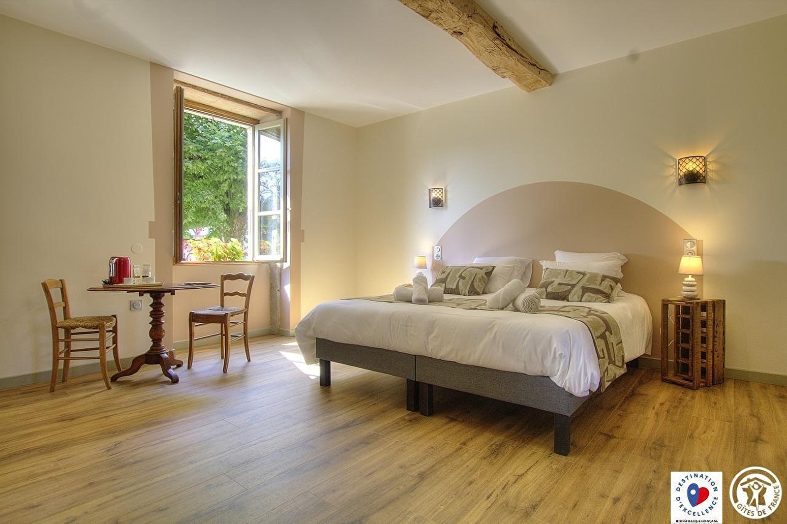 De kamer Hirondelle op de begane grond kijkt uit op twee majestueuze platanen en is toegankelijk voor mindervaliden. Het is een rustige cocon om te ontspannen, nieuwe energie op te doen en weer in contact te komen met de natuur. Het bed, de douche, het meubilair en het toilet zijn ontworpen om zelfstandig gebruikt te worden.