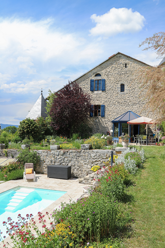 De meeste kamers bevinden zich op de tweede verdieping. Daar zal een onvergelijkbaar uitzicht op de tuinen, het zwembad en de Valromey u elke ochtend verwelkomen vanuit de grote, private en zonnige groene woonkamer, met, achter een tussenschot, zijn comfortabele tweepersoonskamer.