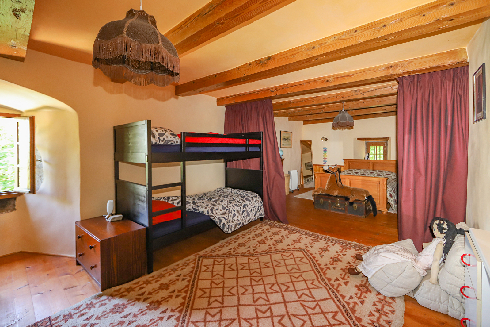 Ook op deze verdieping: de mooie tweepersoonskamer van ST ARTHAUD, evenals de grote slaapzaal met zijn vier stapelbedden plus een tweepersoonsbed achter gordijnen. Deze kamers delen dezelfde doucheruimte en WC, of kunnen gebruik maken van de badkamer op de verdieping eronder.