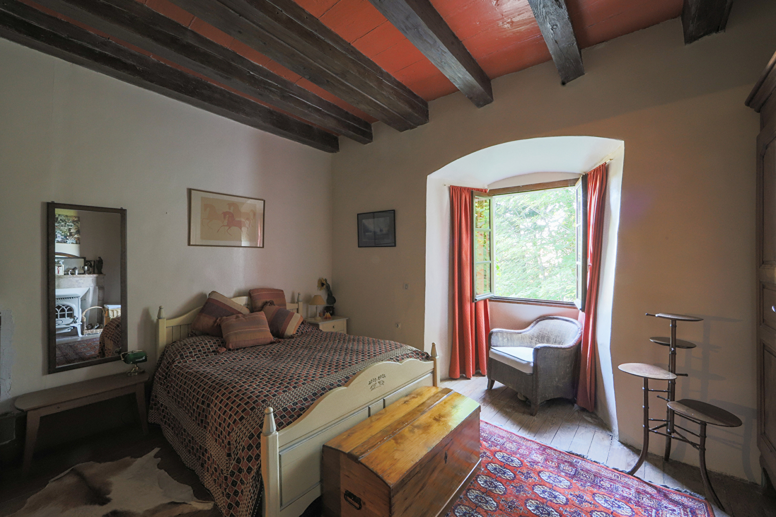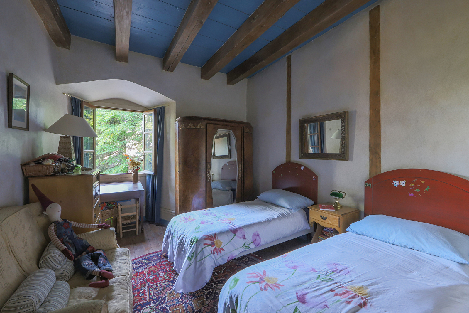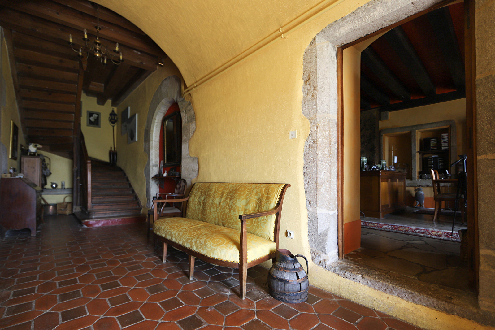Eventueel kan, in geval van een groep, op de eerste verdieping een mooie tweepersoonskamer ingericht in Marokkaanse okertinten worden toegevoegd, en, net ernaast, een kleine blauwe kamer met twee eenpersoonsbedden. Er zijn ook drie treden naar elk van deze twee kamers, die op het noorden liggen en een badkamer delen.