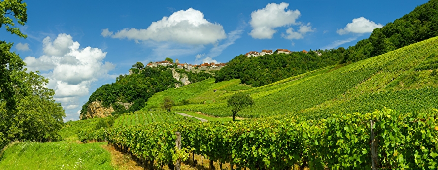 Vanaf een hoge rots kijkt Château-Chalon uit op de wijngaarden van de bekende Vin Jaune. In het plaatsje, ontstaan rond het gelijknamige kasteel en een benedictijnse abdij, zijn nog resten van de donjon te vinden, en de romaanse Sint-Pieterskerk.