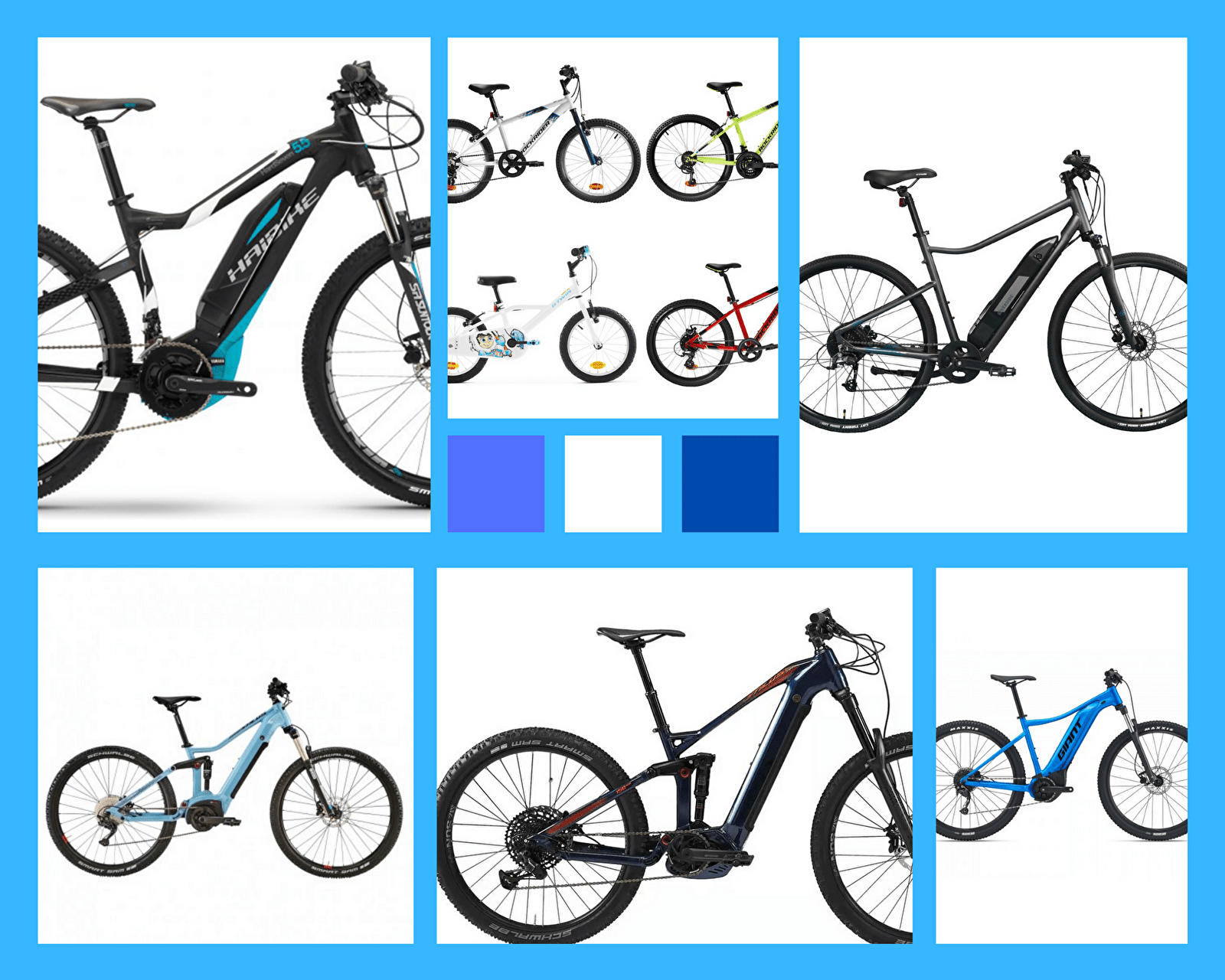 Verhuur van elektrische mountainbikes voor volwassenen en junioren, elektrische mountainbikes, mountainbikes voor volwassenen en kinderen en fietskarren.