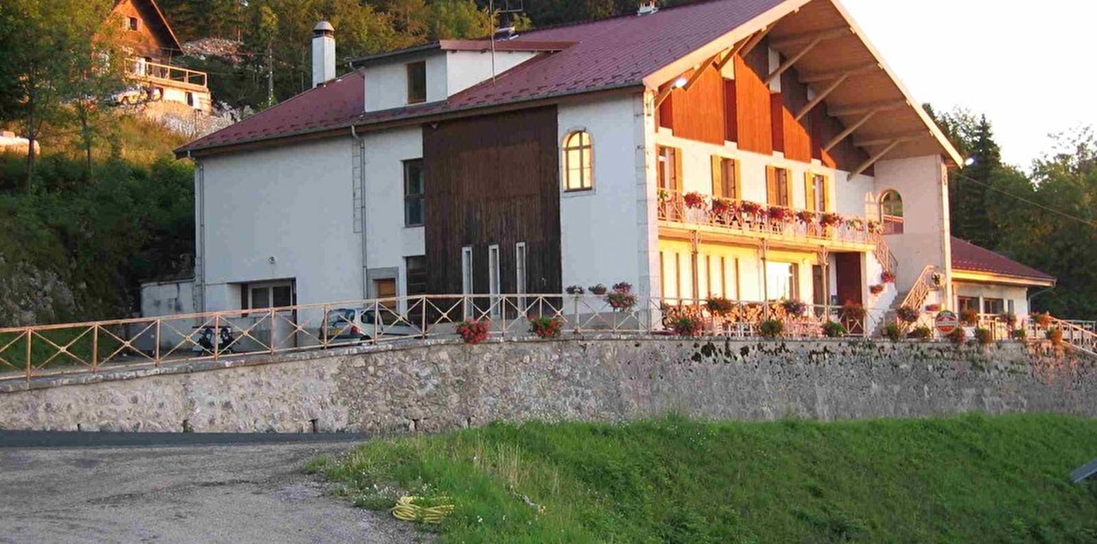 Begane grond: eetkamer, woonkamer met houtkachel, speelzaal (tafelvoetbal, tafeltennis, geluidsinstallatie en videoprojector), activiteitenruimte (seminar, zang, meditatie, enz.). Uitgeruste keuken. 1e en 2e verdieping: 14 kamers met 2 tot 8 bedden. Privé- en collectieve sanitaire voorzieningen, wastafels en toiletten in elke kamer. Centrale verwarming op hout. Mogelijkheid om 2 grote zalen te huren voor feesten of evenementen (200m² - 70 personen). Terras, parkeerplaats in de buurt. Langlaufen, rodelbaan in de buurt, boswandelingen, vijver. Lake Nantua, Retord plateau. Een ideale plek om je batterijen op te laden.