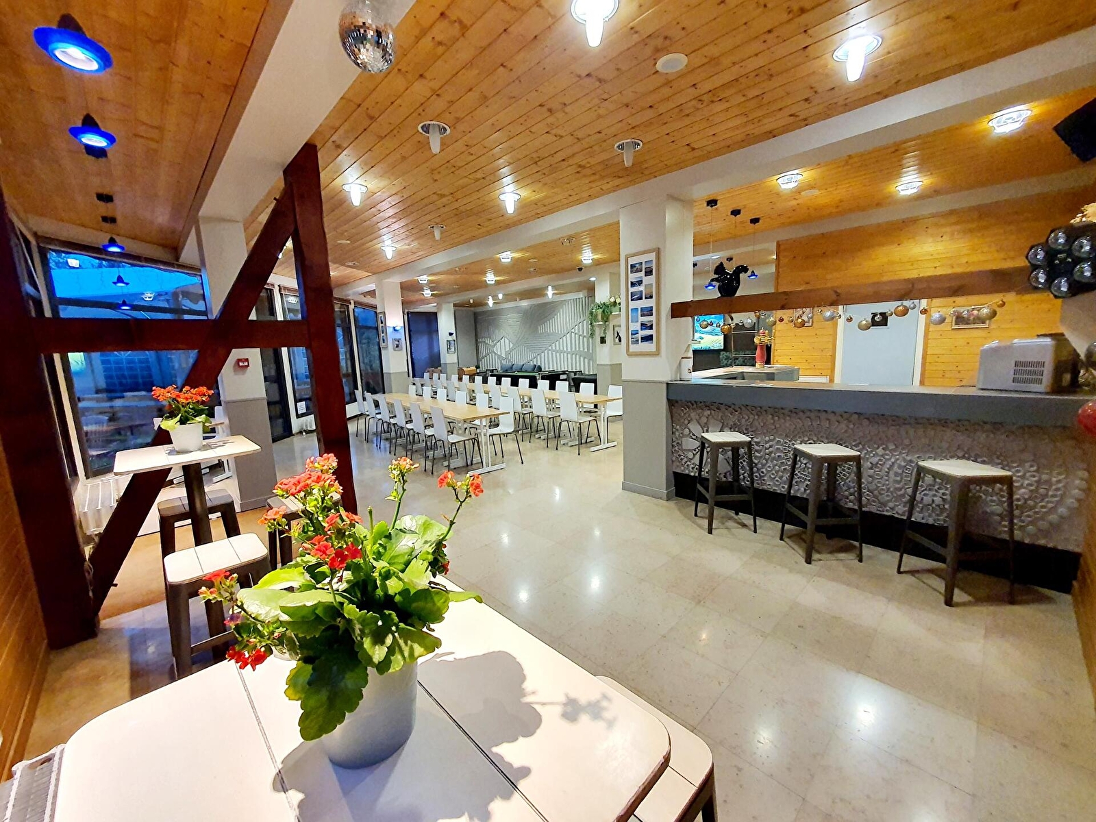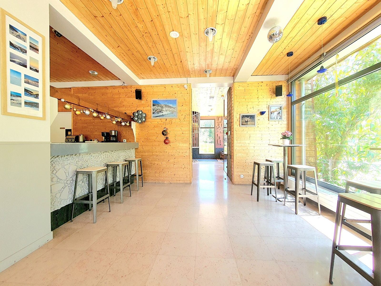 De grote ontvangstruimte op de begane grond is de perfecte plek voor gasten om samen te eten, biljart of tafelvoetbal te spelen, of te genieten van een drankje aan de bar of in de lounge voor de open haard. De volledig uitgeruste professionele keuken biedt tal van mogelijkheden voor het bereiden van onvergetelijke eetervaringen, die zich voortzetten op het grote terras met feesttent van de lente tot de herfst, waar BBQ's en aperitieven een vast onderdeel zijn tijdens de zomermaanden.