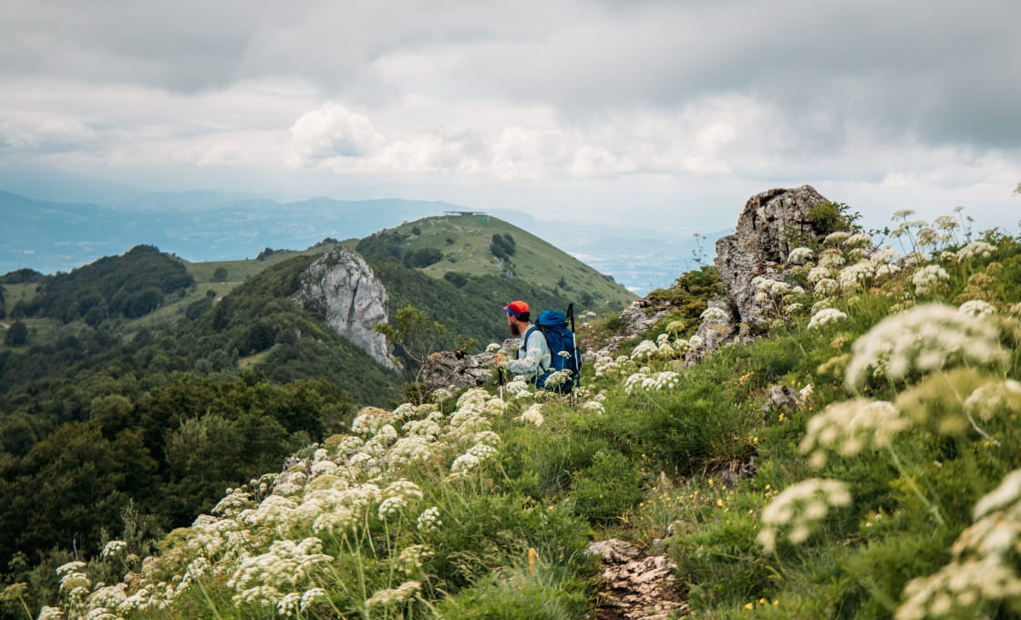 Ontdek de Pertes de la ValserineDe tocht richting de Grand Colombier vormt de laatste etappe van deze ingekorte GTJ versie. Deze top van de Ain ligt vlak bij Culoz. Het gebied is bekend bij wielrenners en biedt een schitterend uitzicht op het Lac du Bourget en de Alpen. Ik vond het contrast tussen de lentebloemen, weilanden en grijze wolken echt fantastisch, maar ik hoop dat jij beter weer en een breed uitzicht krijgt. Want met een beetje geluk zie je dan namelijk de bekende Mont-Blanc.