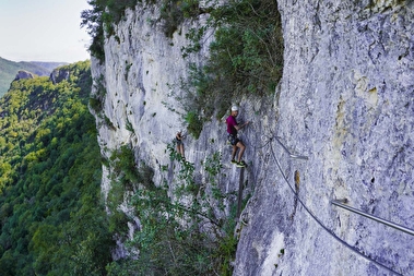 Het parcours begint met een dalende ladder. Je moet geconcentreerd blijven en je niet laten overweldigen door de uitgestrektheid en het verticale landschap om je heen! Dankzij de levenslijn en met je voeten stevig op de ijzeren spijlen klim je langs de rotswand. Je voelt de spanning in je armen, maar het gaat al iets makkelijker. Je durft zelfs naar beneden te kijken op de "Cluse des Hôpitaux". Aan het einde van het parcours ben je blij dat je de verticale wereld weer verlaat, maar ook dat je de uitdaging met de diepte bent aangegaan!