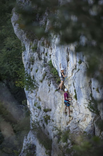 Het weekend begint in Hostiaz, in het zuiden van het Juragebergte. Hier rollen de rotsen hun tapijt van kalkwanden uit boven het bos. Je vindt er een indrukwekkend Via Ferrata parcours: La Guinguette.