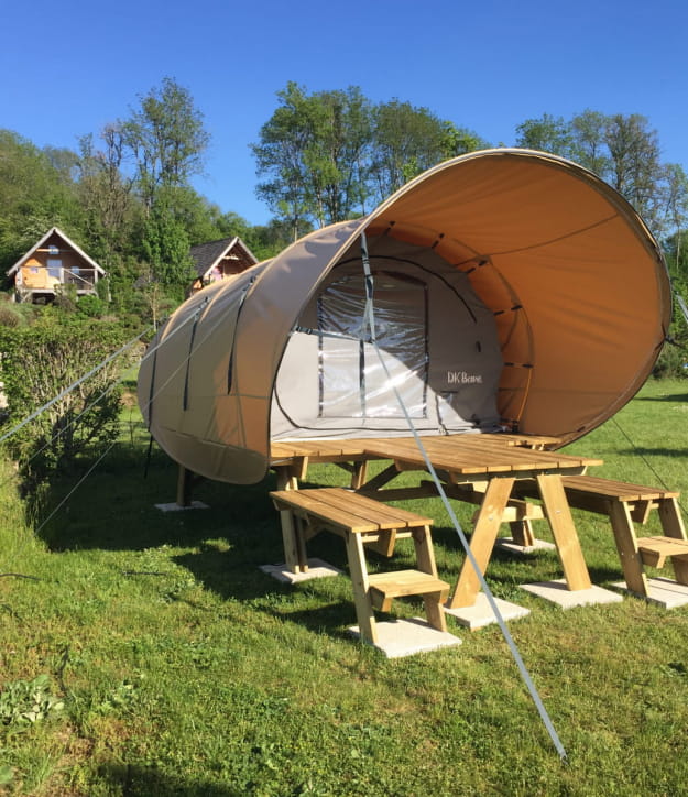 We overnachten op Camping Les 12 Cols in Hauteville. Naast de standaard stacaravans, chaletjes en kampeerplaatsen biedt de camping ook Cocoon tenten. Deze comfortabele tenten staan op palen. Ze hebben een slaapkamer met een matras van 160 cm breed, een voortent met terras en tafel voor het ontbijt. Er is beddengoed aanwezig, en er zijn kampeersets te huur met kookplaat, campingspulletjes en alles wat je nodig hebt om te koken.