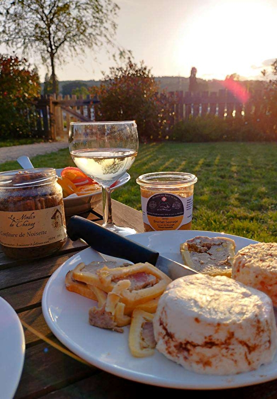 Ga op het terras zitten, met uitzicht op de Grand Colombier en geniet van een heerlijk lunch op basis van de producten van de Ferme du Marais.