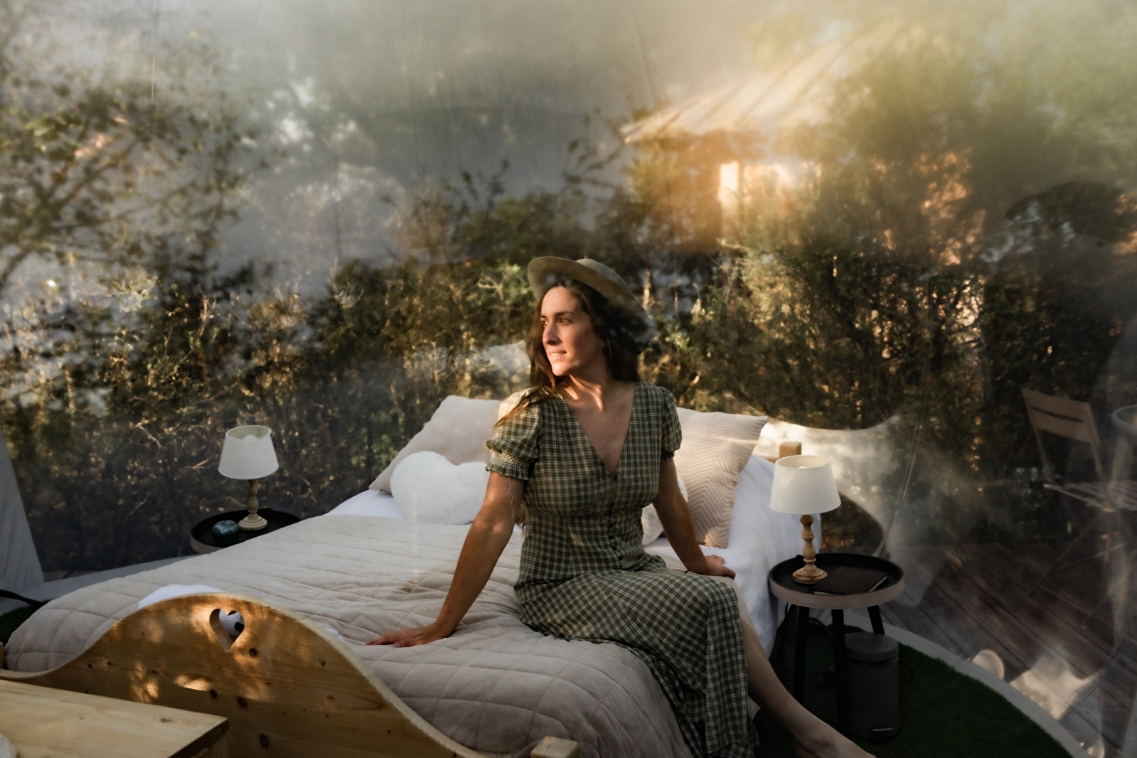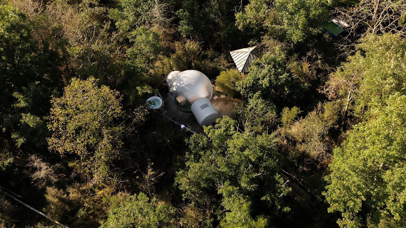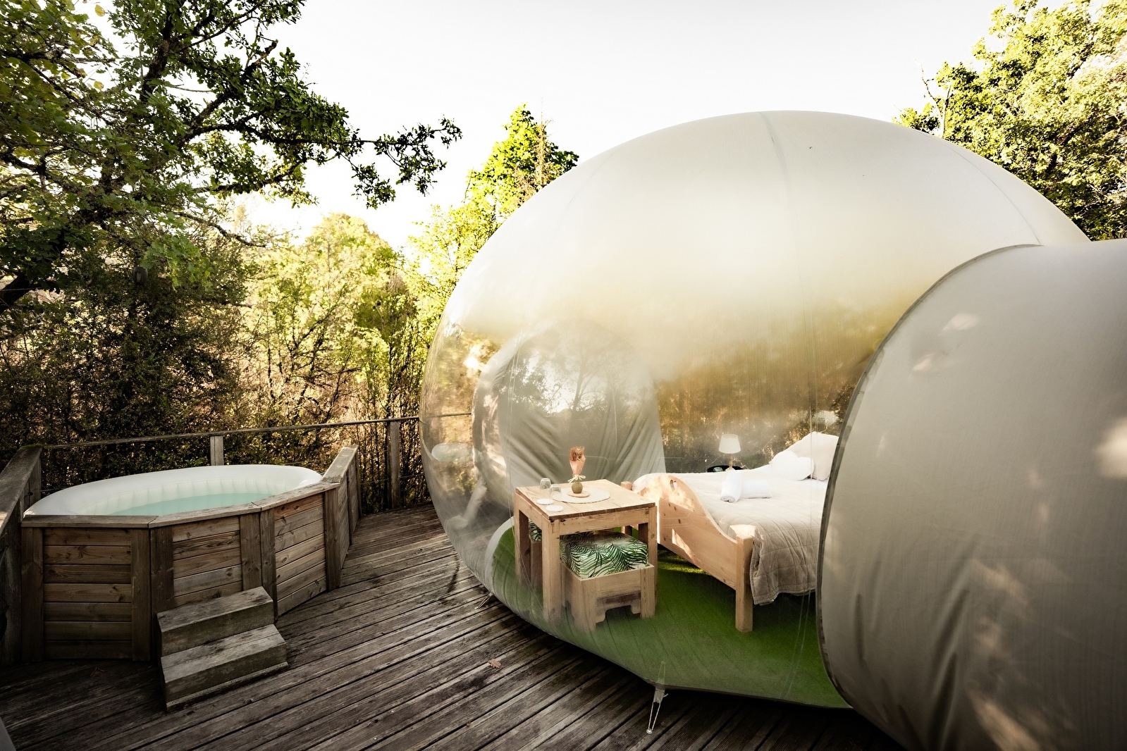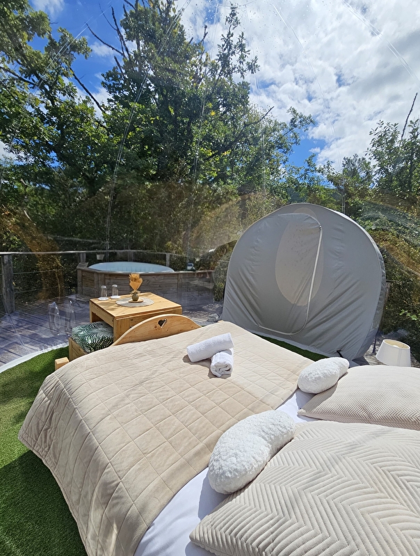 Opgeblazen op een platform ondergedompeld in de vegetatie van de Géorennes, bieden onze twee bubbels u een volledig uitgeruste rustplaats met een tafel en een lounge in de buitenlucht, maar ook met een droog toilet en een eigen badkamer (laken, dekbed, kussens, handdoeken en douchegel tot uw beschikking).