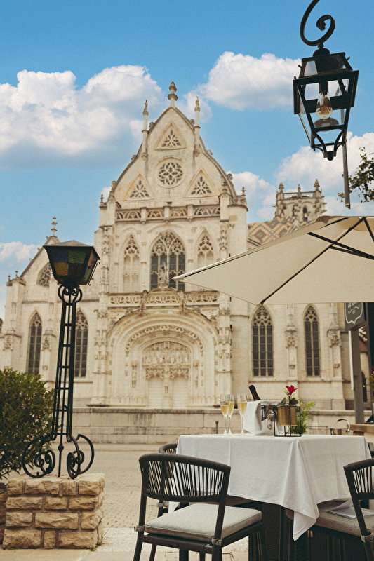 Bij mooi weer kunt u tijdens de lunch of het diner op het terras genieten van het uitzonderlijke uitzicht op het koninklijke klooster van Brou.
