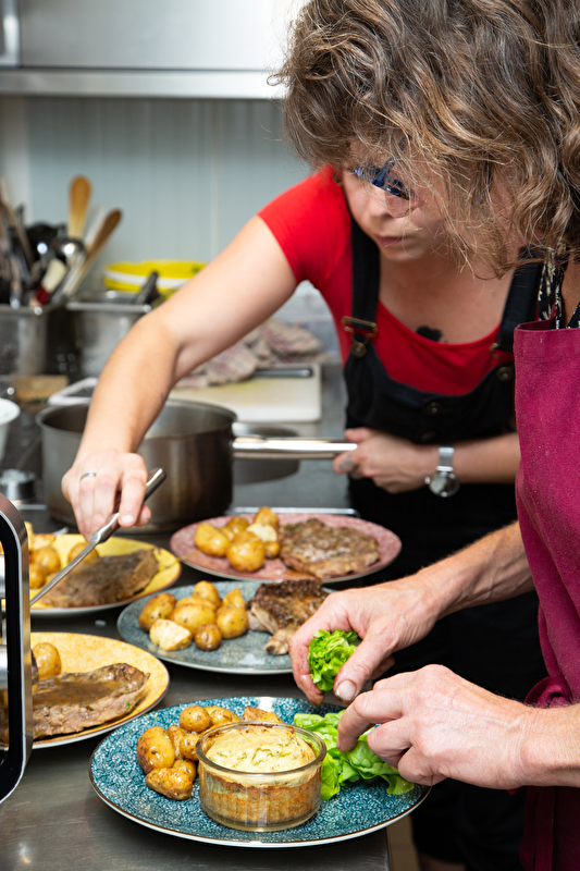 Al ons vlees (rund-, kalfs- en varkensvlees) is afkomstig van dieren die in de open lucht op onze weilanden worden gefokt. Groenten, meel en kaas worden ook op onze boerderij geproduceerd.