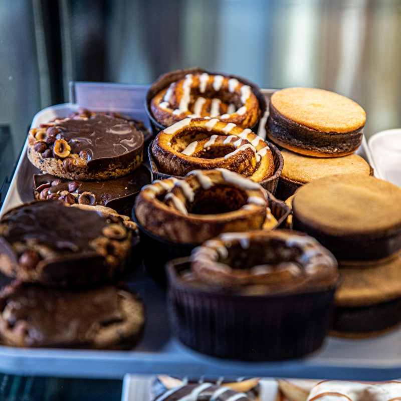 Bij de koffie is er een selectie gebak voor fijnproevers (donuts, muffins) en een reeks snelle hartige snacks (ciabatta's, croque-monsieur).