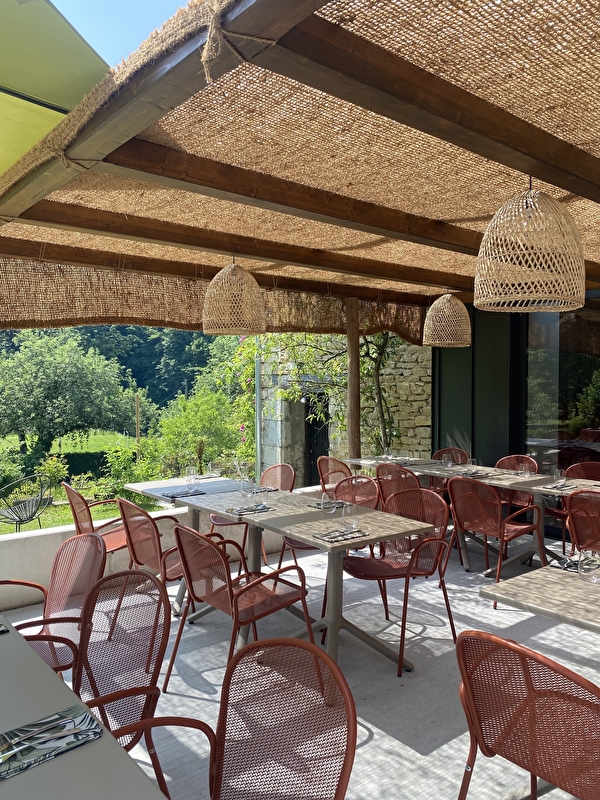 Geniet bij mooi weer van het terras, met uitzicht over de boomgaard in de beschutting van de natuurlijke schaduw, of kies voor het restaurant in de oude schuur, of ontspan op de comfortabele banken in de intieme sfeer van de gewelfde zaal.