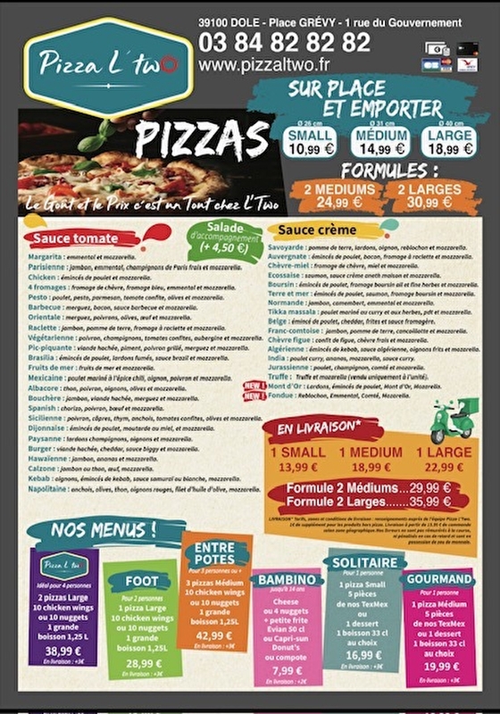 Bij bezorging, ter plaatse of om mee te nemen, het team van Pizza L'TWO biedt je de beste manier om al je avonden op te fleuren en jezelf alleen of met anderen te trakteren op gezellige en feestelijke momenten!