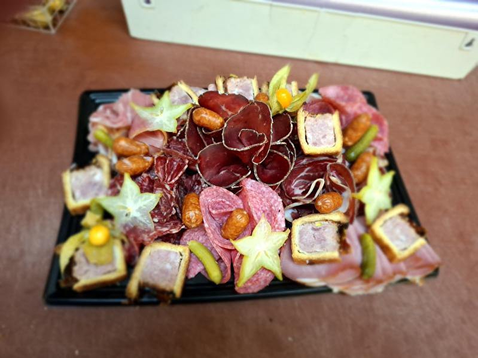 - Huisgemaakte en bekroonde vleeswaren: Laat je verleiden door een breed assortiment vleeswaren die ter plekke worden bereid volgens traditionele recepten. Onze producten winnen regelmatig prijzen, zoals onze bloedworst, winnaar van een gouden medaille (2019), of onze hoofdpaté, winnaar van een Europese Trofee. Je kunt ook onze emblematische recepten proberen, zoals de terrine van onze grootmoeder of onze rillettes comtoises.