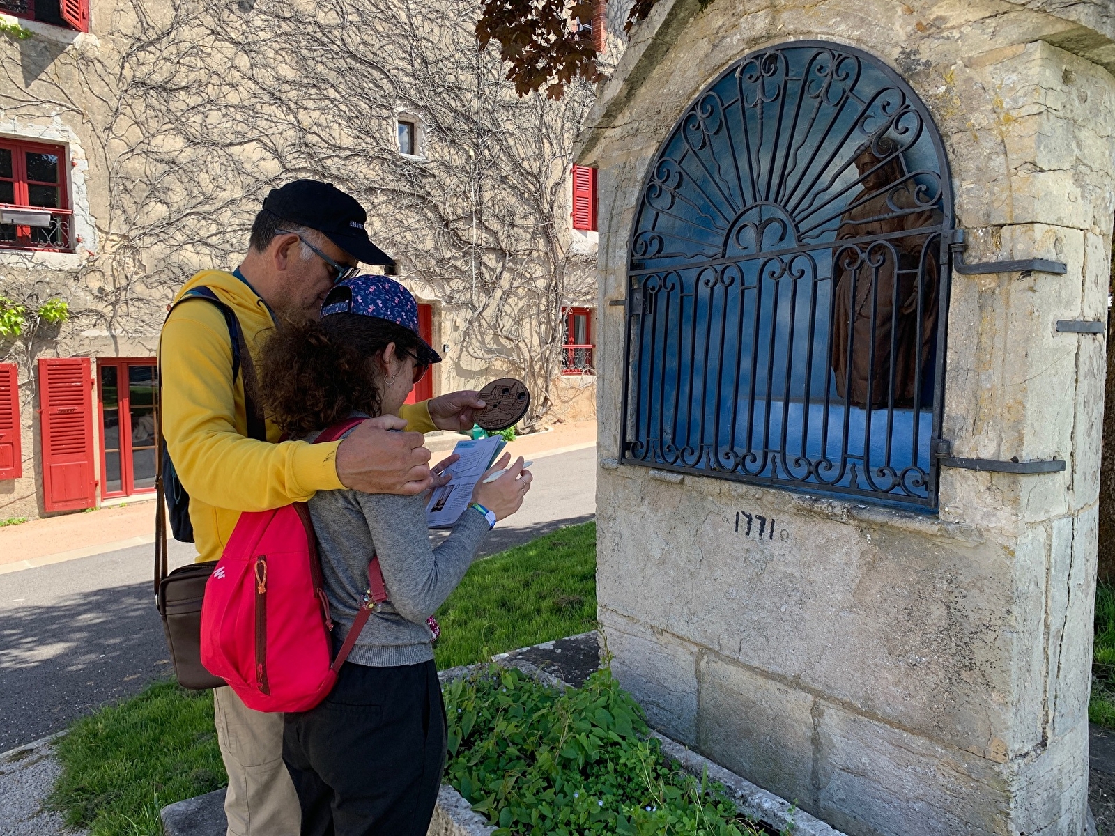Tijdens zijn laatste opgravingen ontdekte je geschiedenisleraar, die ook een groot specialist is op het gebied van palafittische sites (een nogal ingewikkeld woord om prehistorische sites te beschrijven die op palen zijn gebouwd), een gegraveerde steen. Je kunt hem bekijken bij het toeristenbureau. Aan jou om het te ontcijferen!
