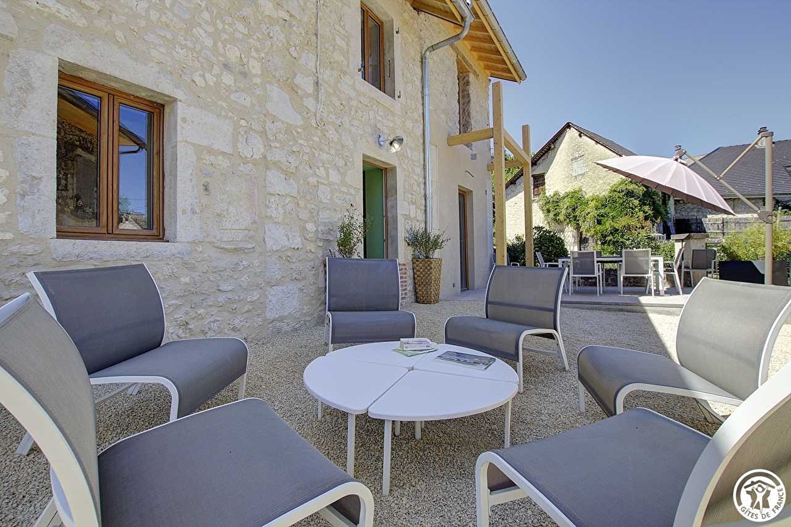 De gîte ligt op ongeveer 4 km van Le Colombier, in het centrum van het dorp en naast een gemeenschappelijke parkeerplaats. Via een beveiligde poort kom je op de privébinnenplaats met terras en ruim tuinmeubilair. Deze volledig gerenoveerde gîte is ontworpen voor maximaal 6 personen met zijn drie slaapkamers en twee badkamers. De hoofdingang komt uit op een hal die leidt naar - aan je linkerhand - een ontspannende zitkamer, en aan je rechterhand, een volledig uitgeruste, functionele keuken met eethoek. Een openslaande deur geeft direct toegang tot het terras. Een toilet met wastafel is beschikbaar op de begane grond. Twee trappen leiden naar de slaapkamers. De houten trap, bereikbaar vanuit de hal, leidt naar twee slaapkamers: een met een tweepersoonsbed (140x190) en de andere met een eenpersoonsbed (140x190), met daartussen een doucheruimte. De deur aan de achterkant van de keuken leidt naar een bijkeuken met wasmachine, wasdroger en gootsteen. Een deur leidt naar een gedeeltelijk overdekt buitenterras met een zithoek. Een houten en stalen trap leidt naar de derde en laatste slaapkamer. Deze onafhankelijke slaapkamer met privébalkon heeft beddengoed van 140x190, een bureau en een doucheruimte met geïntegreerd toilet. Op hetzelfde niveau is er een grote kamer (onverwarmd) met een oppervlakte van 43 m², ideaal om te ontspannen of gewoon te lezen.