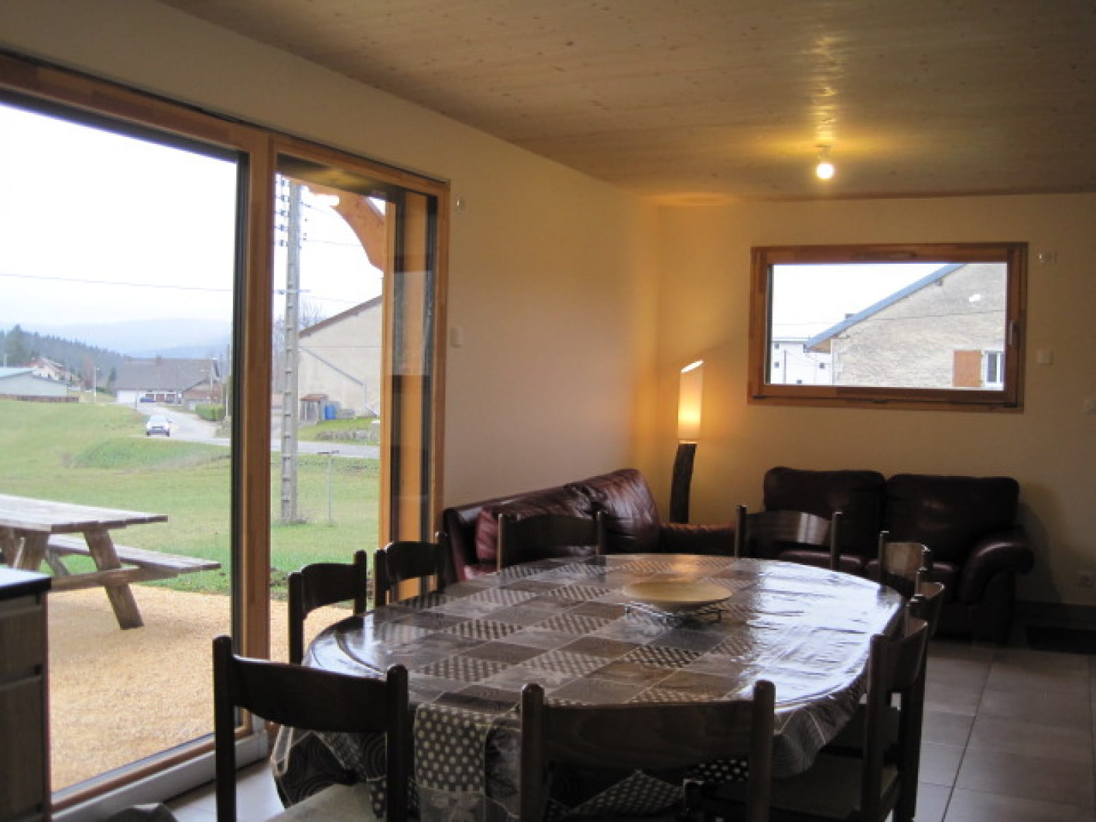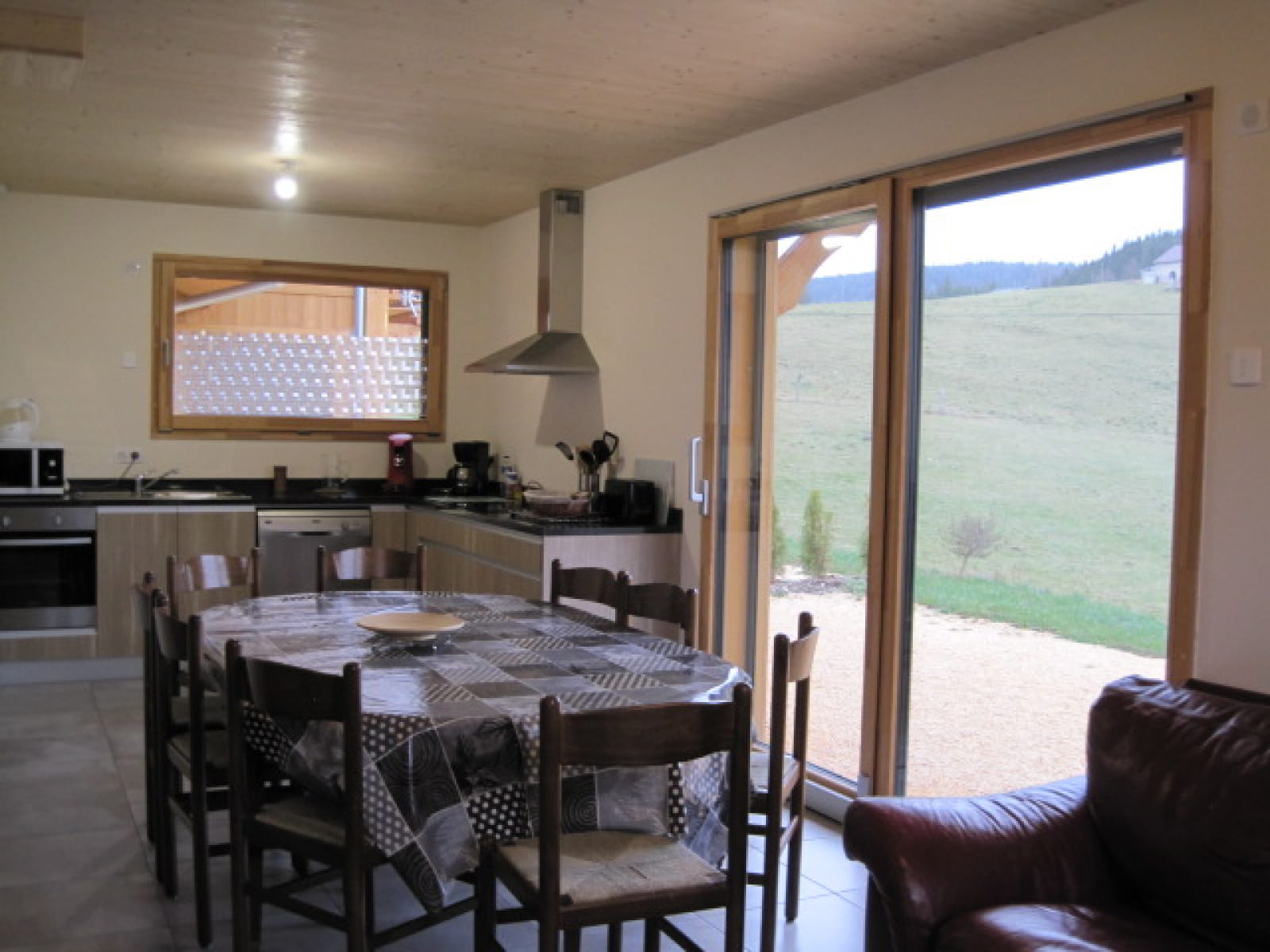 Een keuken-woonkamer van 35m2 met uitzicht op de weilanden en bossen.