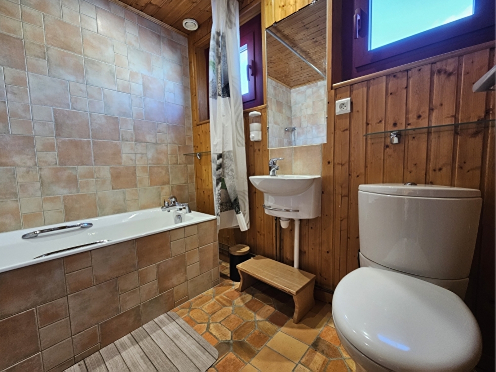 Op hetzelfde niveau is een slaapkamer met tweepersoonsbed (180cm/190cm) en een doucheruimte met toilet.