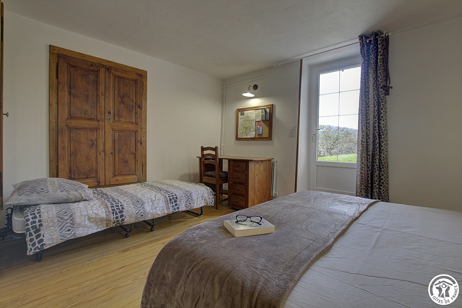 De ingang is vanaf de beveiligde binnenplaats boven, die leidt naar de woonkamer met zijn volledig uitgeruste keuken en open woonkamer waar je kunt ontspannen voor de open haard. De slaapkamer heeft een parketvloer, een teakhouten bureau, een bed van 160 x 200 cm en een opklapbed van 90 x 190 cm, en komt uit op het terras met stenen platen en een ononderbroken uitzicht over de boomgaard. Er is ook een doucheruimte en wc. Aangrenzend ligt een tweede gîte voor 5 personen, waardoor het gemakkelijker wordt om samen te komen met familie of vrienden en optimaal te profiteren van de grote boomgaard die ter beschikking staat van de gasten. Het huis kijkt uit over een groene vallei waar de Anconnans en de Oignin langs kronkelen. De voordelen van de gîte Chez le Tourneur: opgemaakte bedden bij aankomst, handdoeken en nutsvoorzieningen inbegrepen.