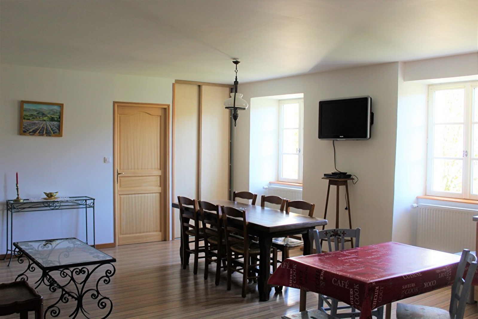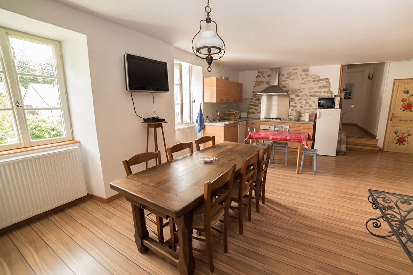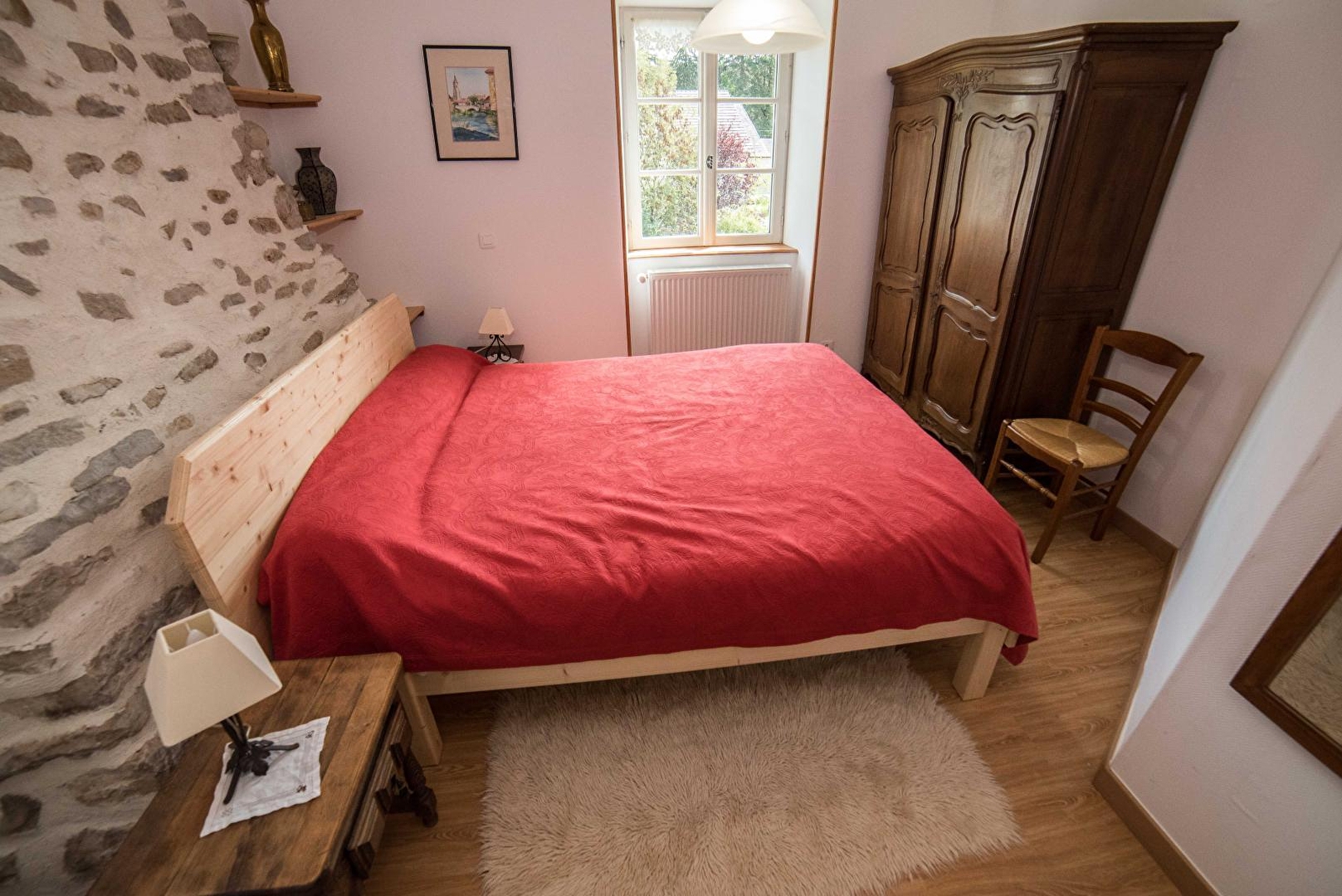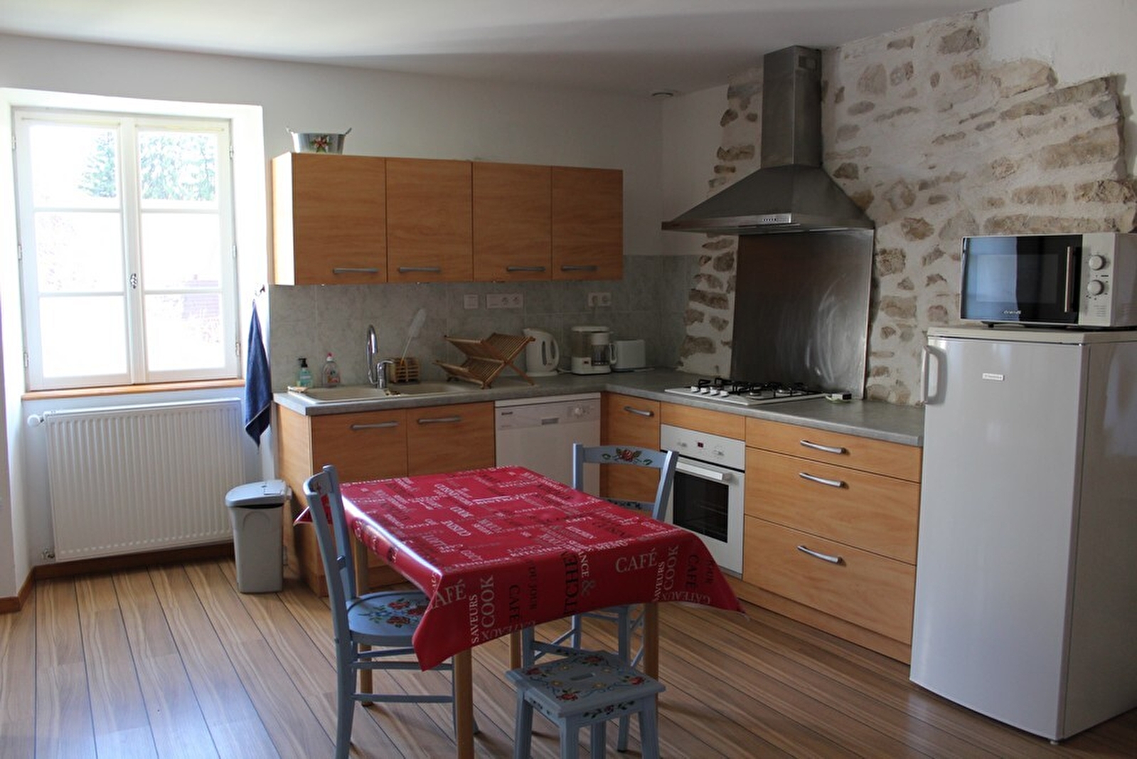 Ruime en lichte gîte gelegen op de eerste verdieping van het huis van de eigenaar met 2 slaapkamers: 1 slaapkamer met een bed van 200x160 en 1 slaapkamer met 2 bedden van 180x90. Volledig ingerichte keuken met vaatwasser, gasfornuis, elektrische oven, koelkast, magnetron, koffiezetapparaat, waterkoker, broodrooster, serviesgoed en bestek. Woonkamer met televisie en WI-FI. Badkamer met douche,