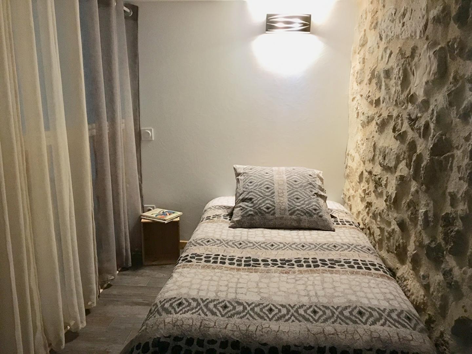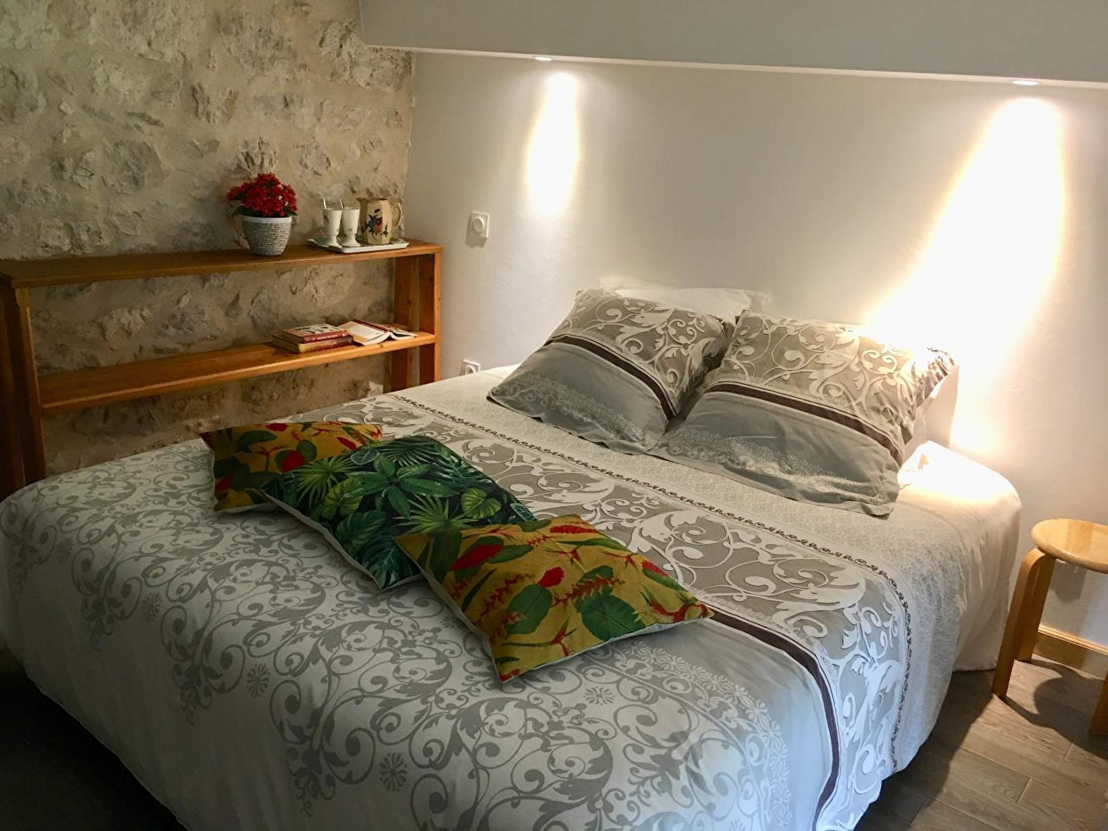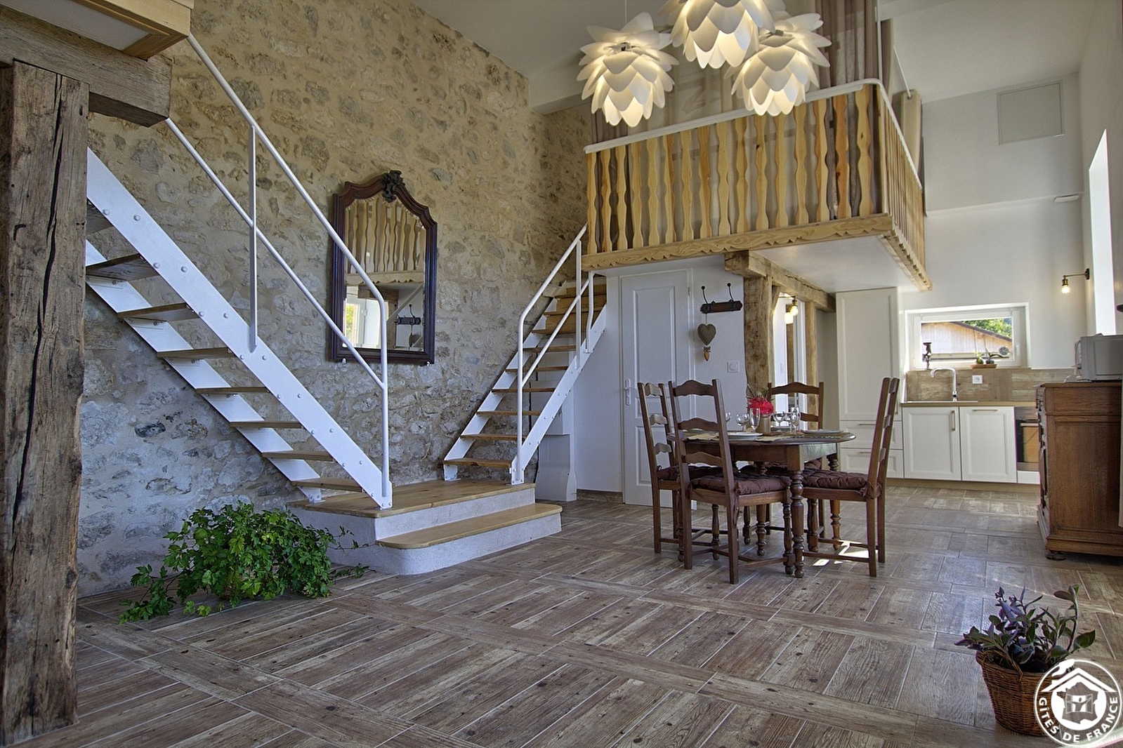 Deze lichte loft heeft een eigen ingang en combineert de charme van hout en steen met trompe l'oeil vloeren en een warme, opgeruimde inrichting. De ingang leidt naar de ingerichte keuken, die uitkomt in de woonkamer met een zithoek met een slaapbank (normaal bed van 160 cm). Een trap leidt naar 2 mezzanines: een kleine mezzanine met een 90*190 bed en een mezzanine met een 160 bed. Een doucheruimte met inloopdouche en aparte WC.