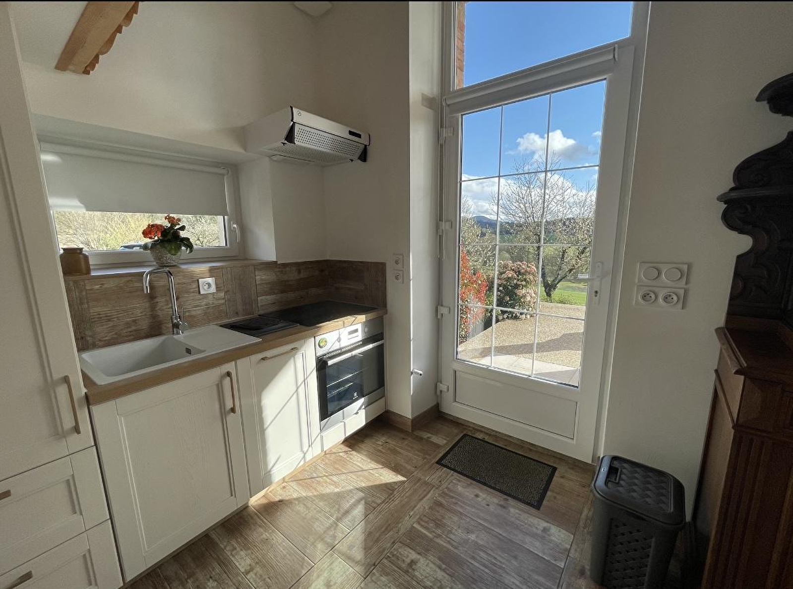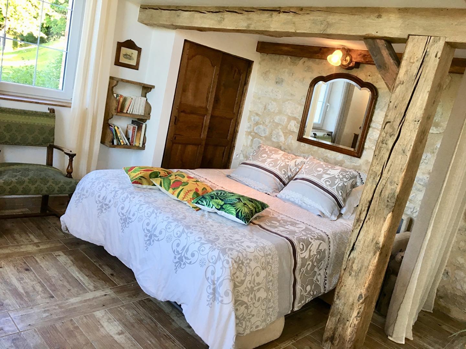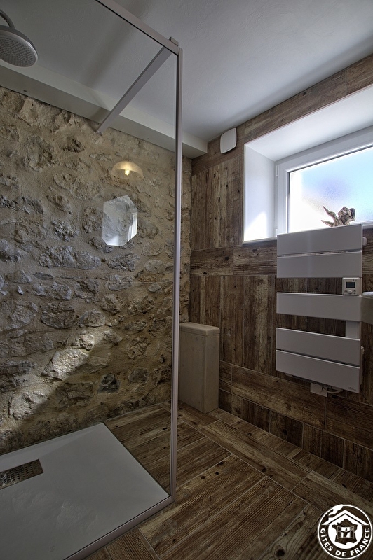 Deze lichte loft heeft een eigen ingang en combineert de charme van hout en steen met trompe l'oeil vloeren en een warme, opgeruimde inrichting. De ingang leidt naar de ingerichte keuken, die uitkomt in de woonkamer met een zithoek met een slaapbank (normaal bed van 160 cm). Een trap leidt naar 2 mezzanines: een kleine mezzanine met een 90*190 bed en een mezzanine met een 160 bed. Een doucheruimte met inloopdouche en aparte WC.