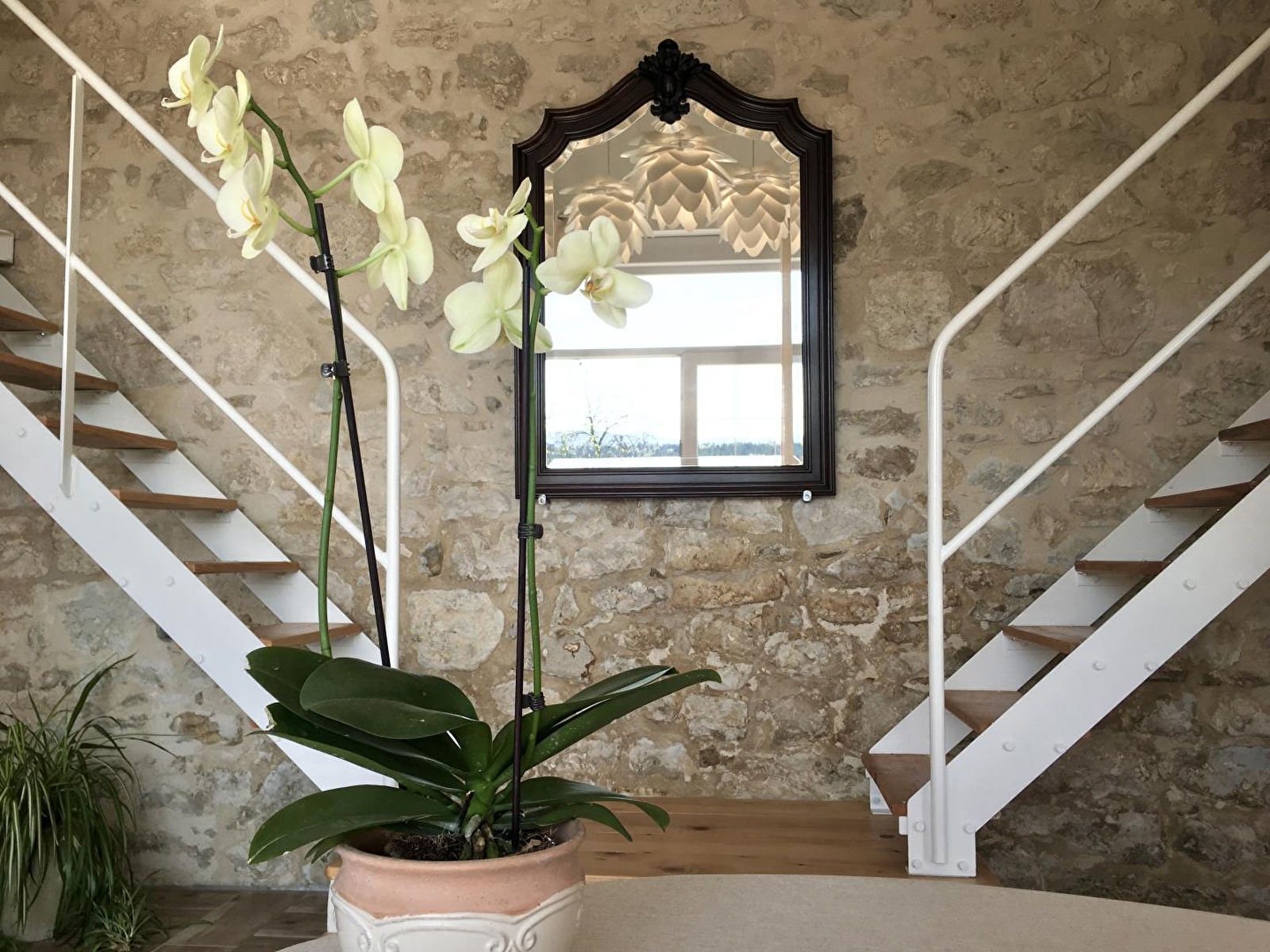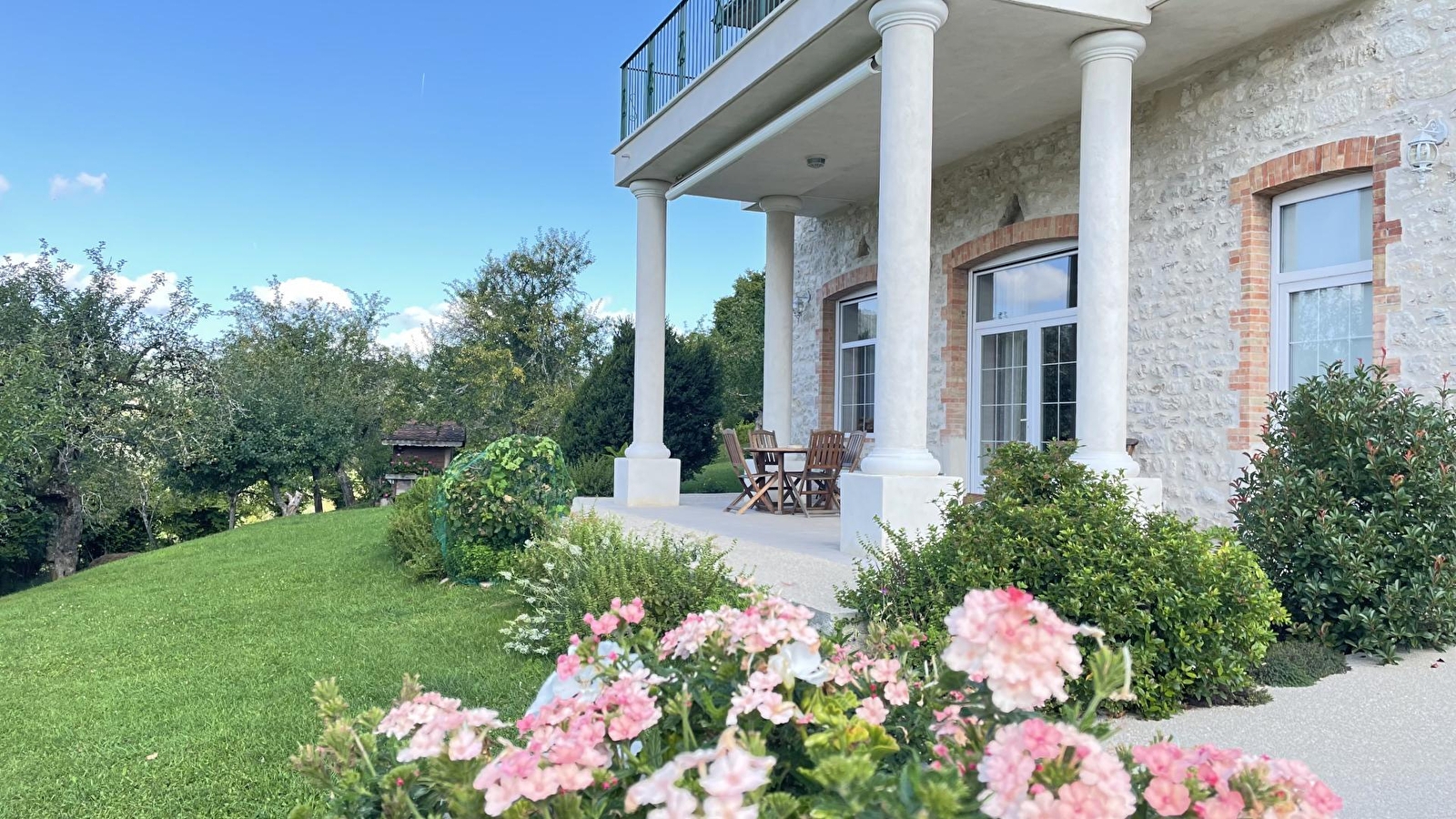 De ingang is vanaf de privébinnenplaats beneden, dan naar het overdekte terras van 50 m² met 4 grote zuilen voor een prachtige gevel van zichtbare stenen.