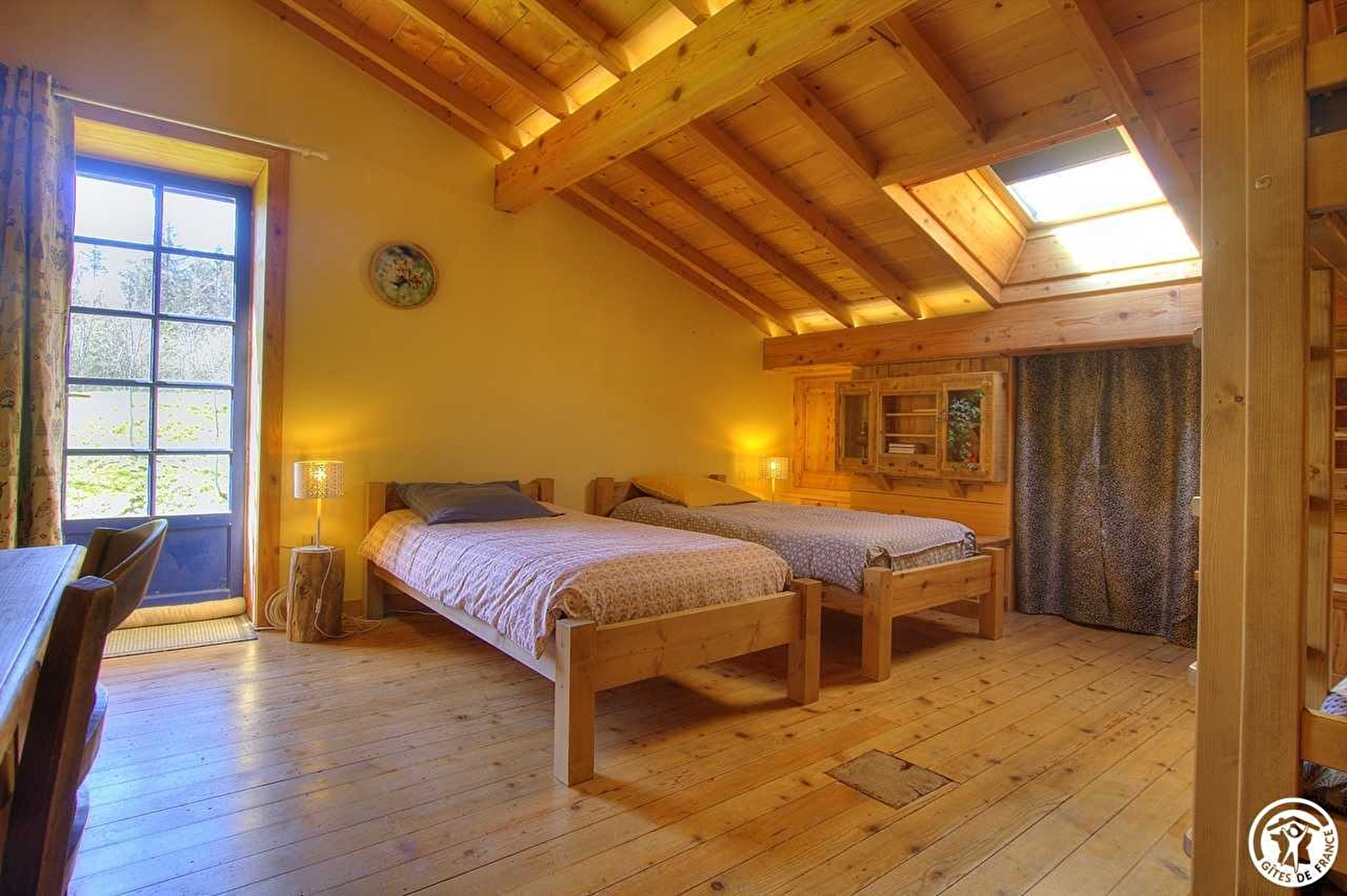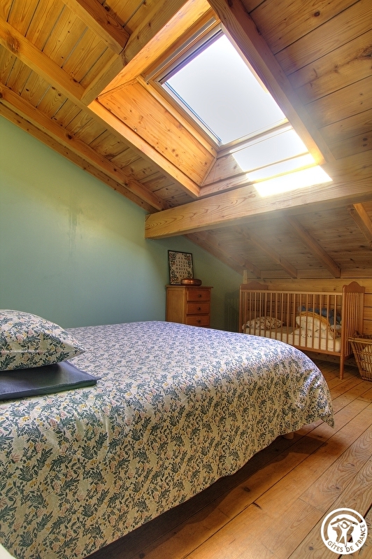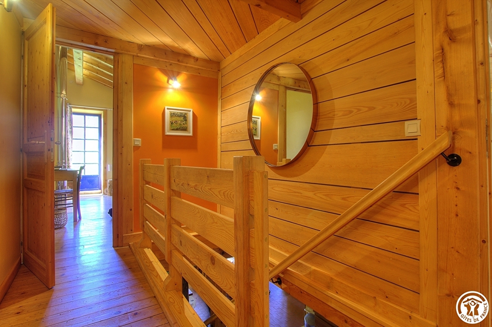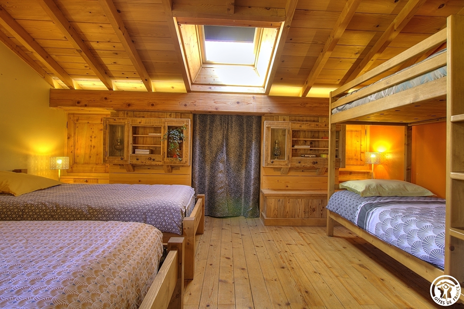 In de schuur: bergruimte voor hout, fietsen en ski's. Ingang vanuit de gîte naar de slaapkamers: 1 kleine slaapkamer met tweepersoonsbed + 1 grote slaapkamer voor 4 personen met kleedkamer.