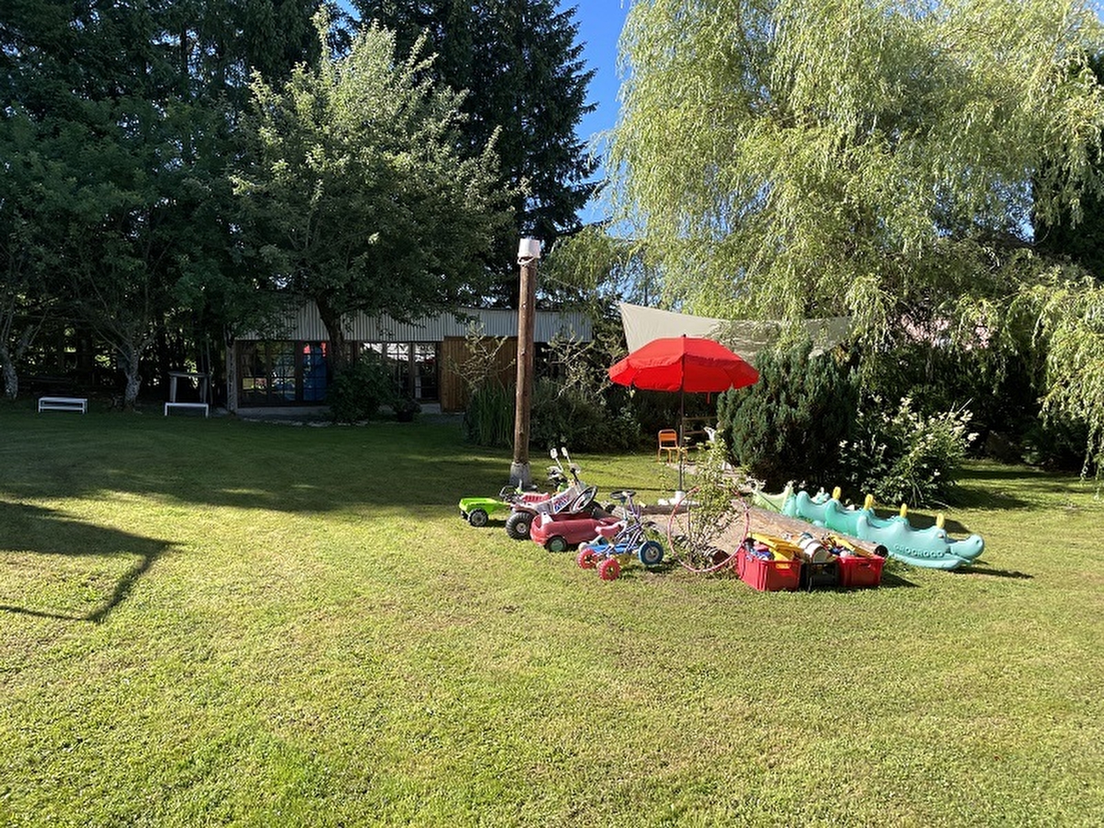 Binnenplaats en omheinde tuin gedeeld met de 2 andere gîtes, tuinmeubelen, barbecue, kinderspelen, schommel, petanquebaan. Aangrenzend park van 5600 m².