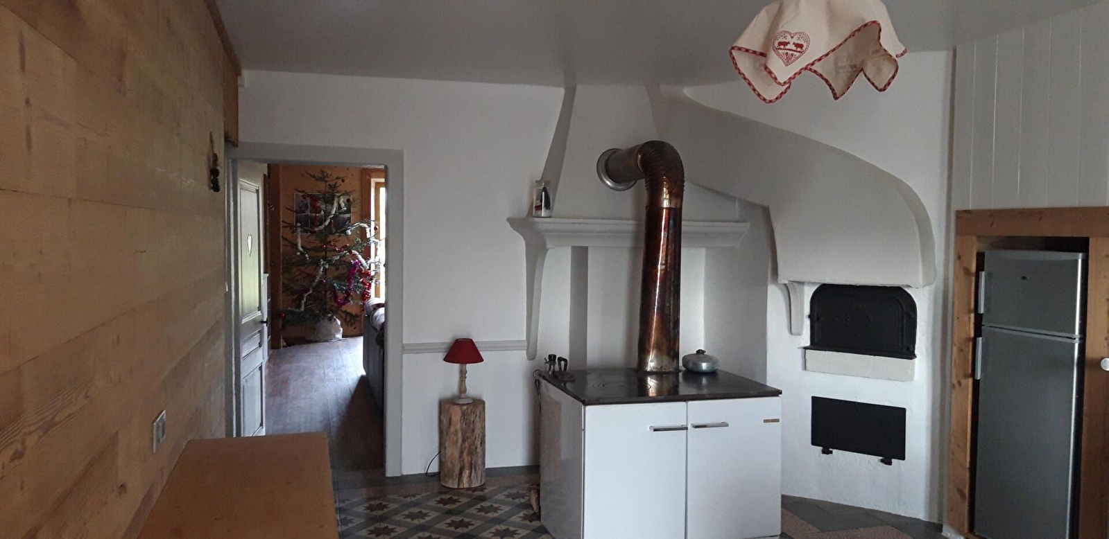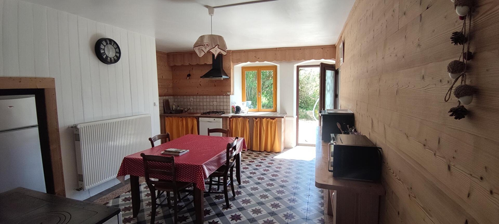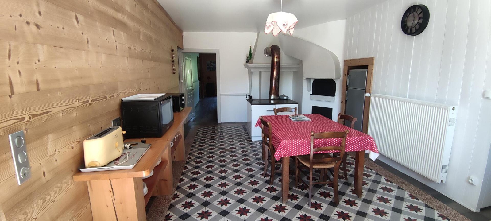 Grote keuken van 20 m² met houtfornuis, kookplaat, vaatwasser, magnetron, mini-oven.