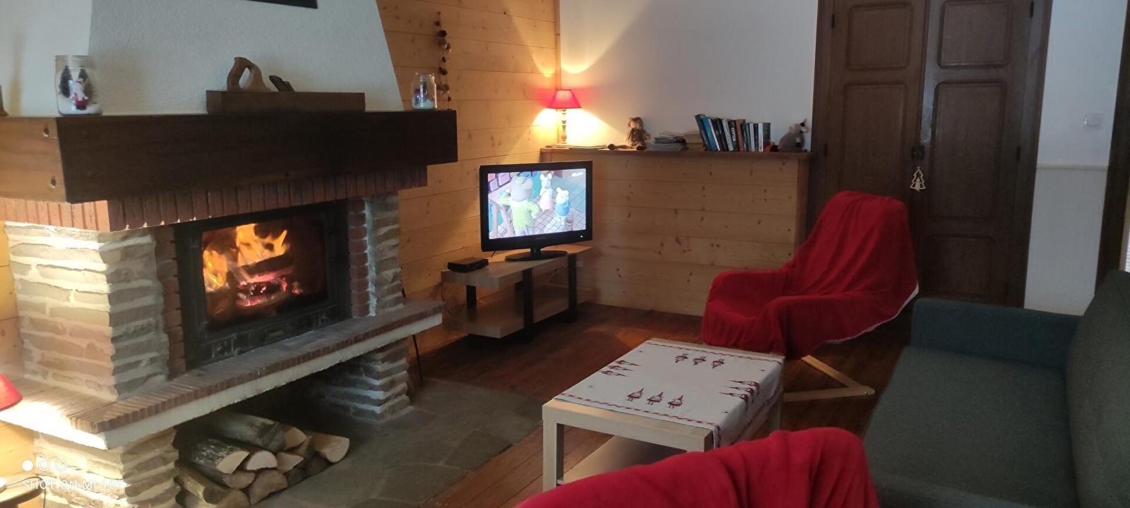Woonkamer van 30 m² met open haard en televisie, wifi.