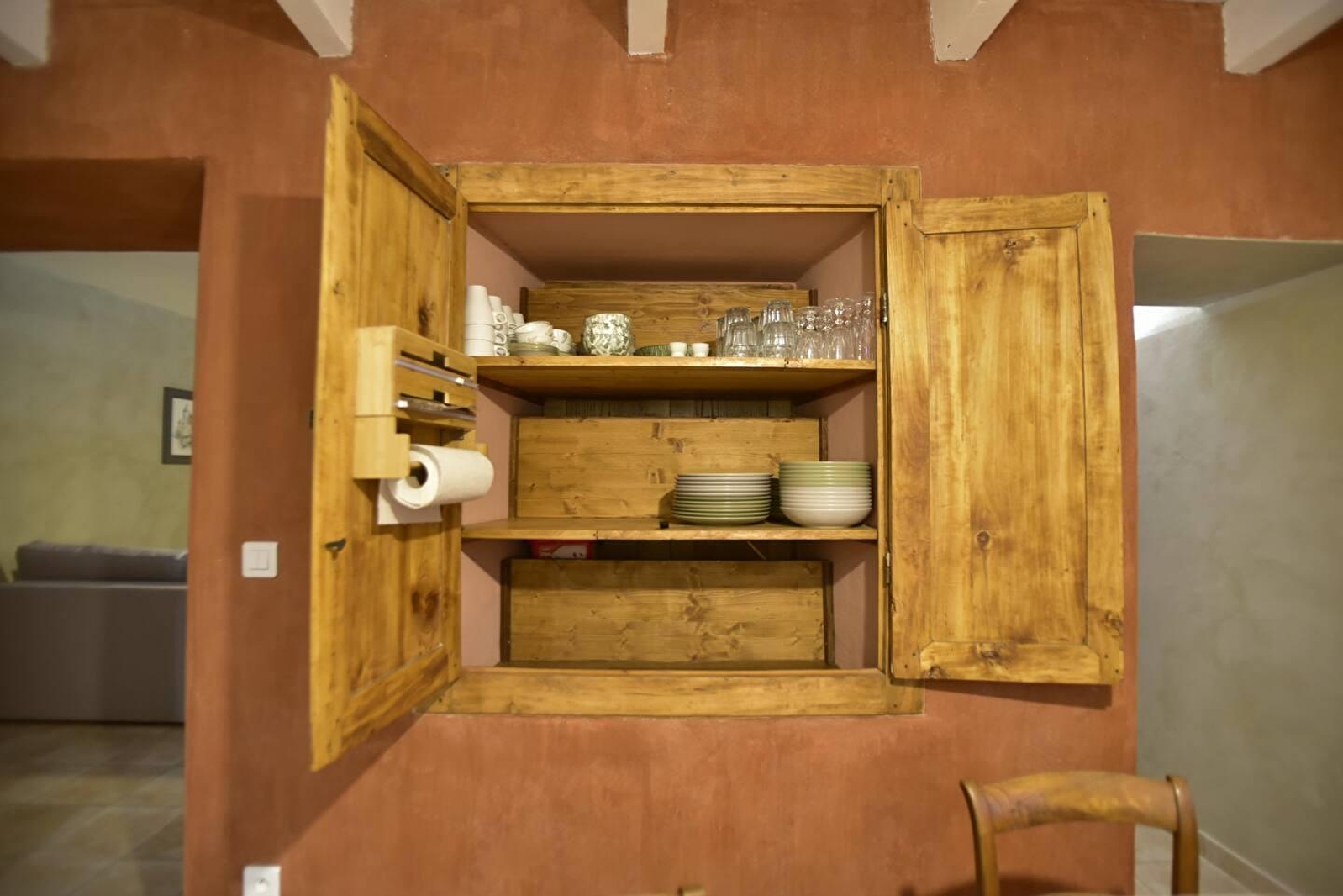 De combinatie van steen, hout en het gebruik van verschillende kalkpleisters (whitewash, tadelakt en 'a fresco' pleisterwerk) geven dit gezellige nest een warme sfeer. Elke kamer is ontworpen met veel aandacht voor detail. In de woonkamer valt bijvoorbeeld de oude boerenwandkast op. En vergeet het oude steenwerk van de stallen niet, dat bewaard is gebleven als decoratief element...