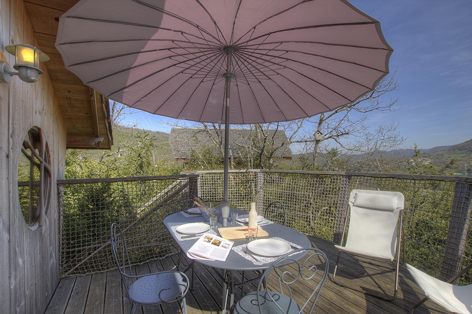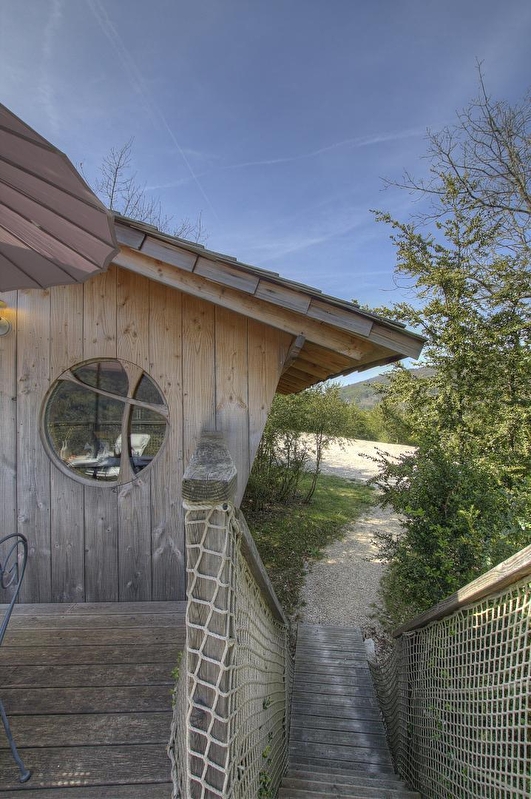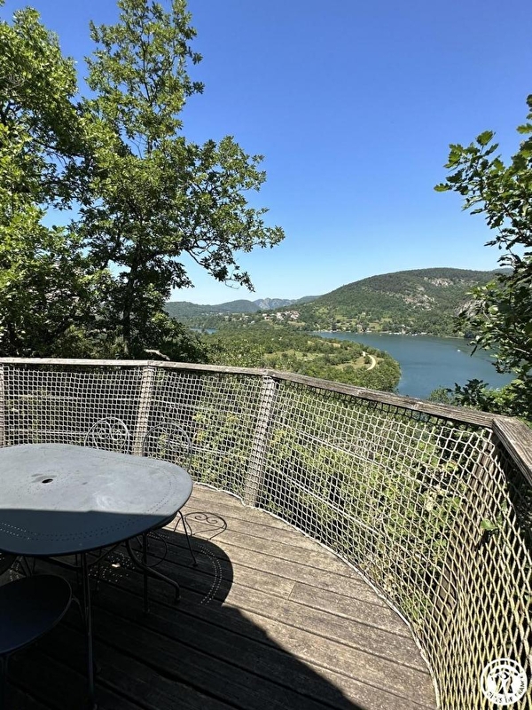 Zodra u aankomt, wordt de setting gezet met de grote beveiligde houten trap die u moet beklimmen om het 15 m² grote terras te bereiken, dat bijna net zo groot is als de hut! Het rechthoekige terras staat trots in zijn groene omgeving en kijkt uit over de rivier de Ain.