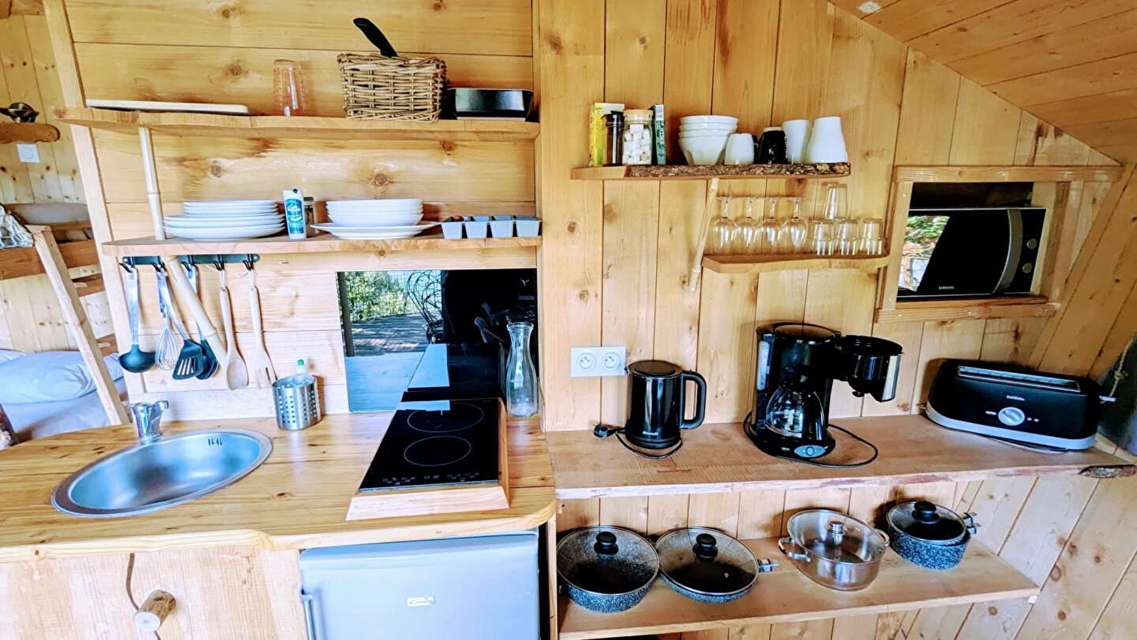 Het terras kijkt uit op de opkomende zon en baadt tot 14.00 uur in het zonlicht. Afgescheiden door een erker, charmeert het interieur van de cabine met zijn 3 ruimtes: aan uw rechterkant, bij binnenkomst, een eethoek met een kitchenette (2 keramische kookplaten, 1 koelkast, 1 magnetron) en zijn "tuintafel" in anijsgroen. Aan de achterkant, een zichtbare slaapruimte met stapelbedden (90 cm) met beschermnetten, en aan de linkerkant bij binnenkomst, een "onzichtbare" slaapruimte voor 2 personen die, zodra het bed in het frame is geklapt, u toelaat van de ruimte te genieten. De toegang tot de doucheruimte/toilet bevindt zich aan de achterkant van de grote leefruimte. Bij aankomst krijgt u een kit met de "basis" producten. Onze favorieten: het uitzonderlijke uitzicht binnen en buiten, de ingenieuze indeling van deze hut, de bakboord/ stuurboord sfeer die ze uitstraalt met haar reusachtige patrijspoort boven de eethoek, de netten die het terras omlijsten en de stapelbedden, de rustgevende harmonie van het hout. Le Chenaie maakt deel uit van een "natuur" site met een totaal van 7 hutten en lodges volledig geïntegreerd in dit buxus bos, genesteld op de hoogten van Serrières sur Ain, met uitzicht op de rivier de Ain. Elke hut heeft zijn eigen identiteit en is gebouwd op palen 2m boven de grond, toegang en terras zijn volledig beveiligd. Uitzonderlijke site, in de Ain kloven, waardoor de praktijk van het kanoën, roeien of gewoon zwemmen. -10% bij een verblijf van 4 nachten van maandag tot donderdag (behalve van 01/07 tot 31/08/2019)