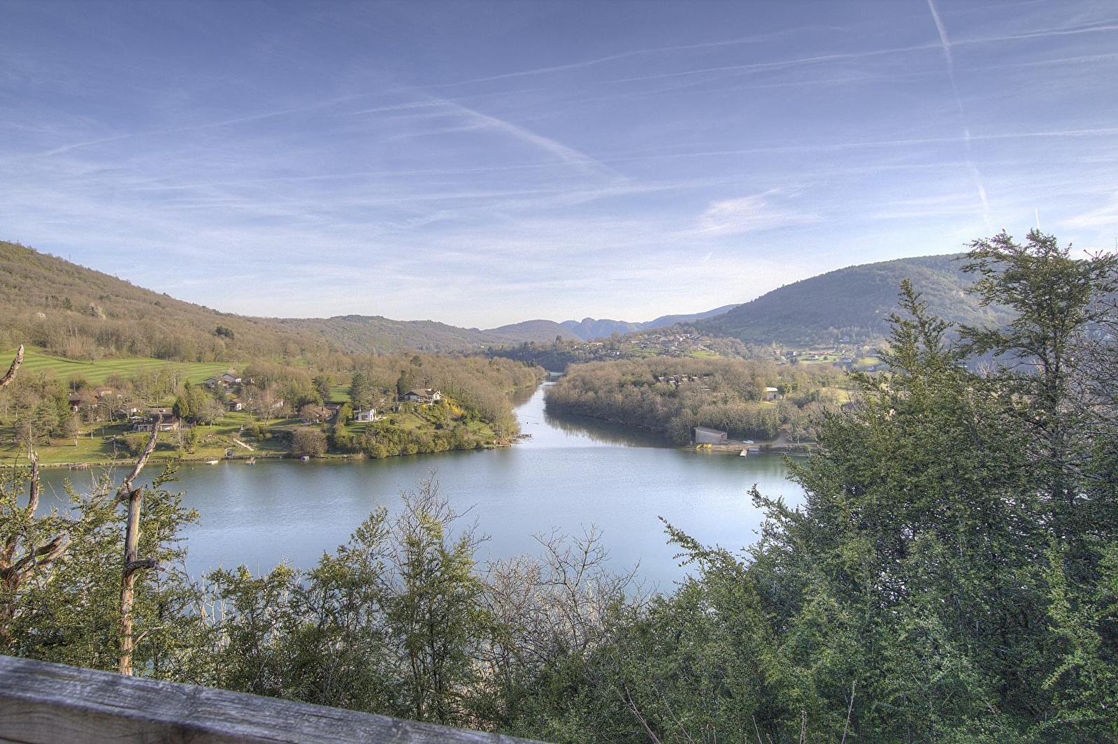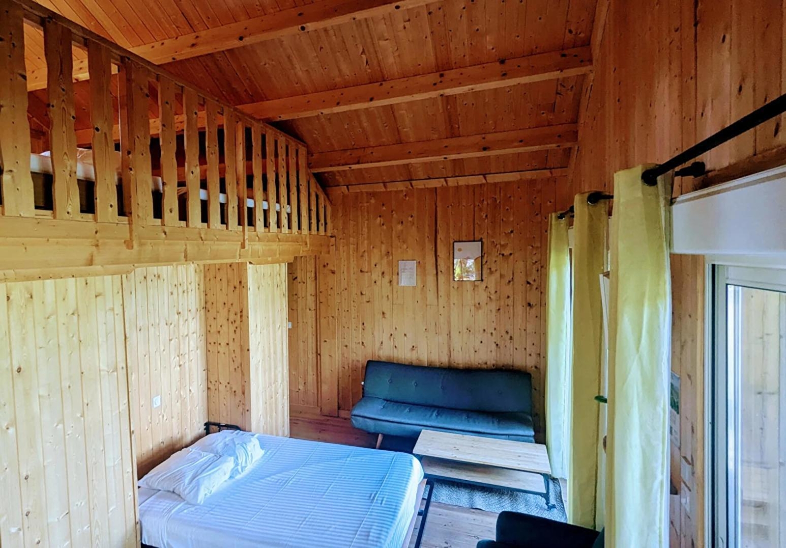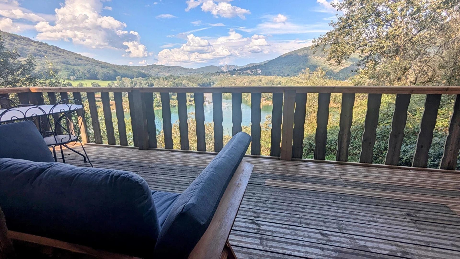 De toegang is direct aan de grote woonkamer, de 2 grote erkers breiden het uit op het rechthoekige terras van 17 m² met uitzicht op de rivier de Ain. Op zonnige dagen kunt u op het terras genieten van de zon in de namiddag en een deel van de avond. De hoofdwoonkamer, met zijn lentegroene sfeer, is voorzien van een eethoek met een "tuinsfeer" en wordt 's avonds omgetoverd tot een slaapgedeelte met zijn tweepersoonsbed (150 cm bed) geïntegreerd in een muurkast. De open mezzanine, bestaande uit twee bedden van 90 cm die bereikbaar zijn via een "smalle" trap, geeft ook uit op de woonkamer. De cocooning toegang maakt een echte intimiteit mogelijk. Weg van de woonkamer, aan de voet van de mezzanine trap, is er een praktische keukenhoek met 2 keramische kookplaten, een kleine koelkast met vriesruimte en een magnetron. De badkamer is toegankelijk vanuit de woonkamer. Bij aankomst krijgt u een kit met de "basis"-producten. Le Betet maakt ook deel uit van een "natuur" site met een totaal van 7 hutten en lodges volledig geïntegreerd in dit buxus bos, genesteld op de hoogten van Serrières sur Ain, met uitzicht op de rivier de Ain. Elke hut heeft zijn eigen identiteit en is gebouwd op palen 2 meter boven de grond, met volledig beveiligde toegang en terras. Een uitzonderlijke plek, in de kloven van Ain, waar men kan kanoën, roeien of gewoon zwemmen. Hoog op de kliffen, mogelijkheid tot wandelen, met GR en PR.