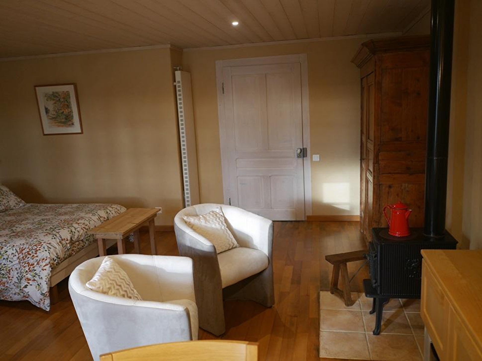 De gîte, ideaal voor een vakantie met twee personen, is gevestigd in een oude Comtoise boerderij in een gehucht in de vallei van Angillon, op het eerste plateau van de Jura, die zorgvuldig is gerestaureerd met behulp van uitsluitend milieuvriendelijke materialen. Met uitzicht op de opkomende zon heeft deze studio met lemen muren en één verdieping een eigen ingang. Gasten zullen de rust en sereniteit van de omgeving waarderen, evenals het raam met uitzicht op het bos van Fresse en het begin van de Route des Sapins. De locatie in de buurt van Champagnole is ideaal voor het verkennen van uitzonderlijke natuurgebieden zoals meren en watervallen, oplevingen, retraites en belvederes, historische plaatsen zoals de Salines, en de nabijgelegen Doubs met zijn veengebieden, Loue vallei en meren, allemaal op minder dan drie kwartier afstand. Je vindt hier een keuken die uitkomt op een zithoek met een houtkachel om van te genieten, naast centrale verwarming, apart toilet en doucheruimte, een tweepersoons elektrisch boxspringbed (140*200), met tv. Linnengoed is aanwezig en alle voorzieningen zijn inbegrepen! Terras aanwezig, ligstoelen kunnen worden opgezet in de schaduw van de grote essen in de grote tuin. Edith en Bruno helpen je graag op weg. Garage voor fietsen beschikbaar. Je kunt ook een andere gîte voor 2 personen huren in hetzelfde gebouw: de Gîte de l'Angillon.