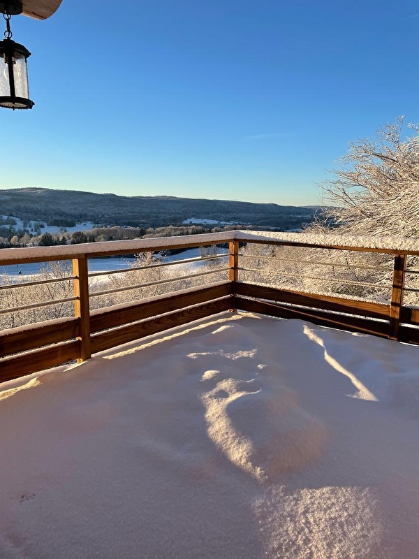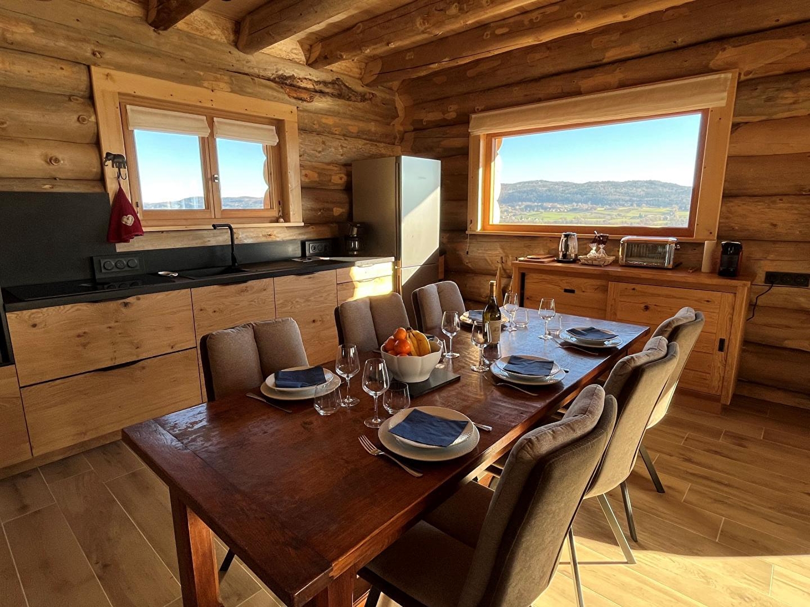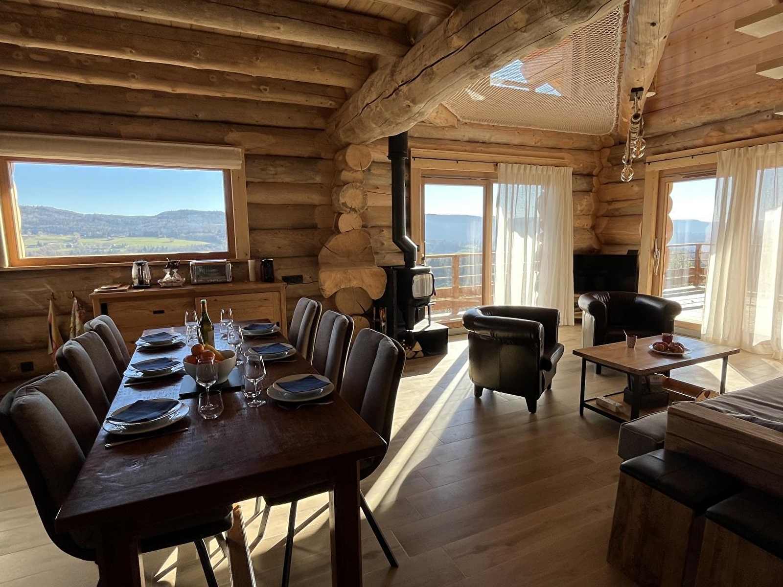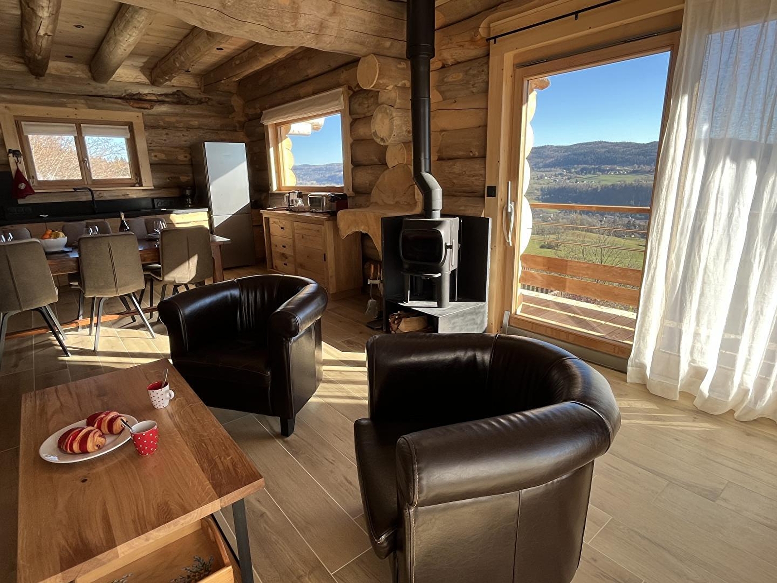 In deze rustgevende, ongerepte omgeving lijkt de tijd stil te staan terwijl je geniet van de sereniteit en het magische houtwerk van dit vrijstaande houten chalet. Je zult genieten van het adembenemende uitzicht van 180° en de gezellige sfeer van het chalet. 1e verdieping: grote woonkamer met volledig ingerichte keuken, zitkamer met TV en houtkachel, master suite met bed van 160x200 en en-suite badkamer met douche, aparte WC, berging. Tweede verdieping: 1 slaapkamer met balkon (160x200), 1 slaapkamer met 2 bedden 90x200 (kan op verzoek worden samengevoegd tot 180x200) en een extra bed (90x190 - een extra persoon toegestaan op verzoek van de eigenaren), 1 badkamer met douche en bad en 1 aparte wc. Voor uw gemak zijn de bedden opgemaakt bij aankomst en zijn er handdoeken aanwezig. Een groot terras met tuinmeubelen, plancha en ligstoelen laat je genieten van de rust en de stilte terwijl je het omliggende platteland bewondert. Een hot tub die het hele jaar door geopend is, biedt je welzijn en ontspanning na activiteiten in de buitenlucht. Garage met elektrische deur (max. hoogte 2 m) voor 1 voertuig. Ideaal gelegen op 2 km van het dorpscentrum, waar je alle winkels vindt die je nodig hebt (restaurant, supermarkt, kaaswinkel, tabakswinkel, etc.). Mountainbike-, langlauf- en sneeuwschoenroutes vertrekken vanaf de gîte en er is een skipiste op 2 km afstand. Het natuurpark van de Chaux Neuve en de kloven van de Saine en de Langouette liggen op ongeveer tien minuten.