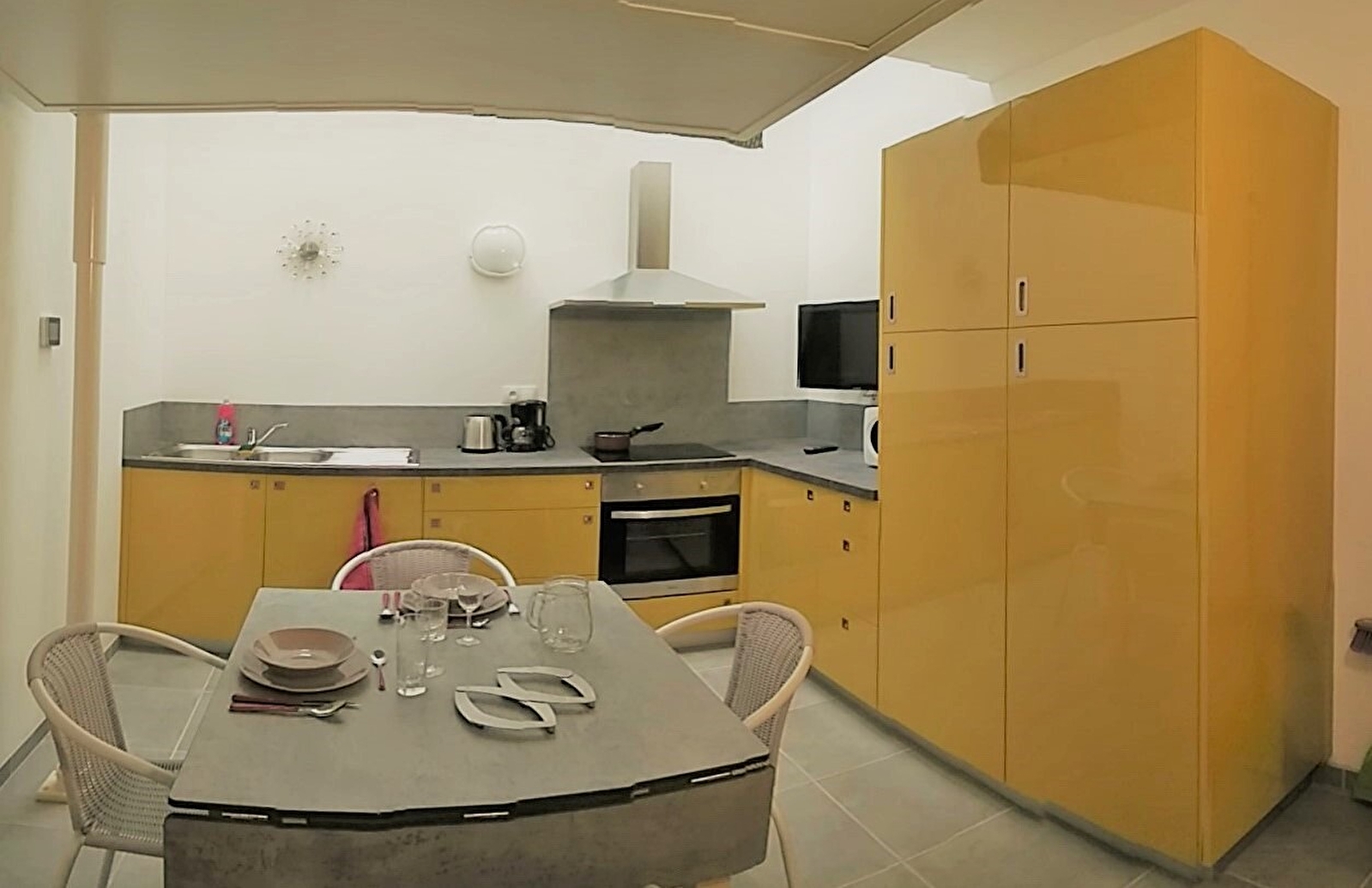 De studio bestaat uit een kamer van 13 m² met een uitgeruste keuken en een uitschuifbaar bed van 140x190 dat van het plafond afloopt tot een hoogte van 1 meter, en een doucheruimte (douche, wastafel, wc). De studio wordt verlicht door twee veluxramen.