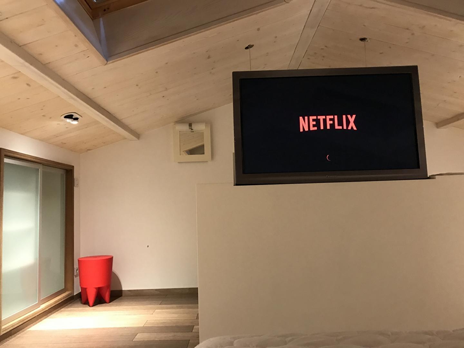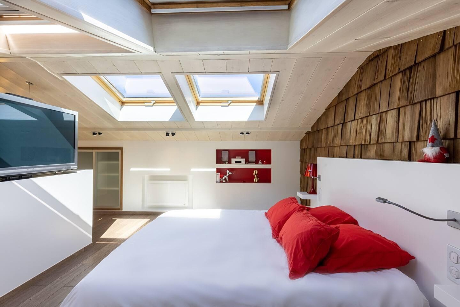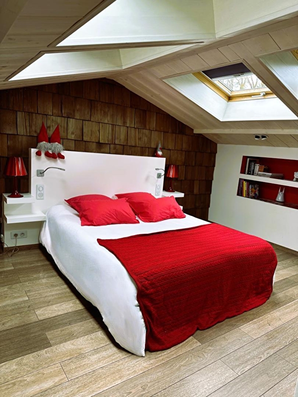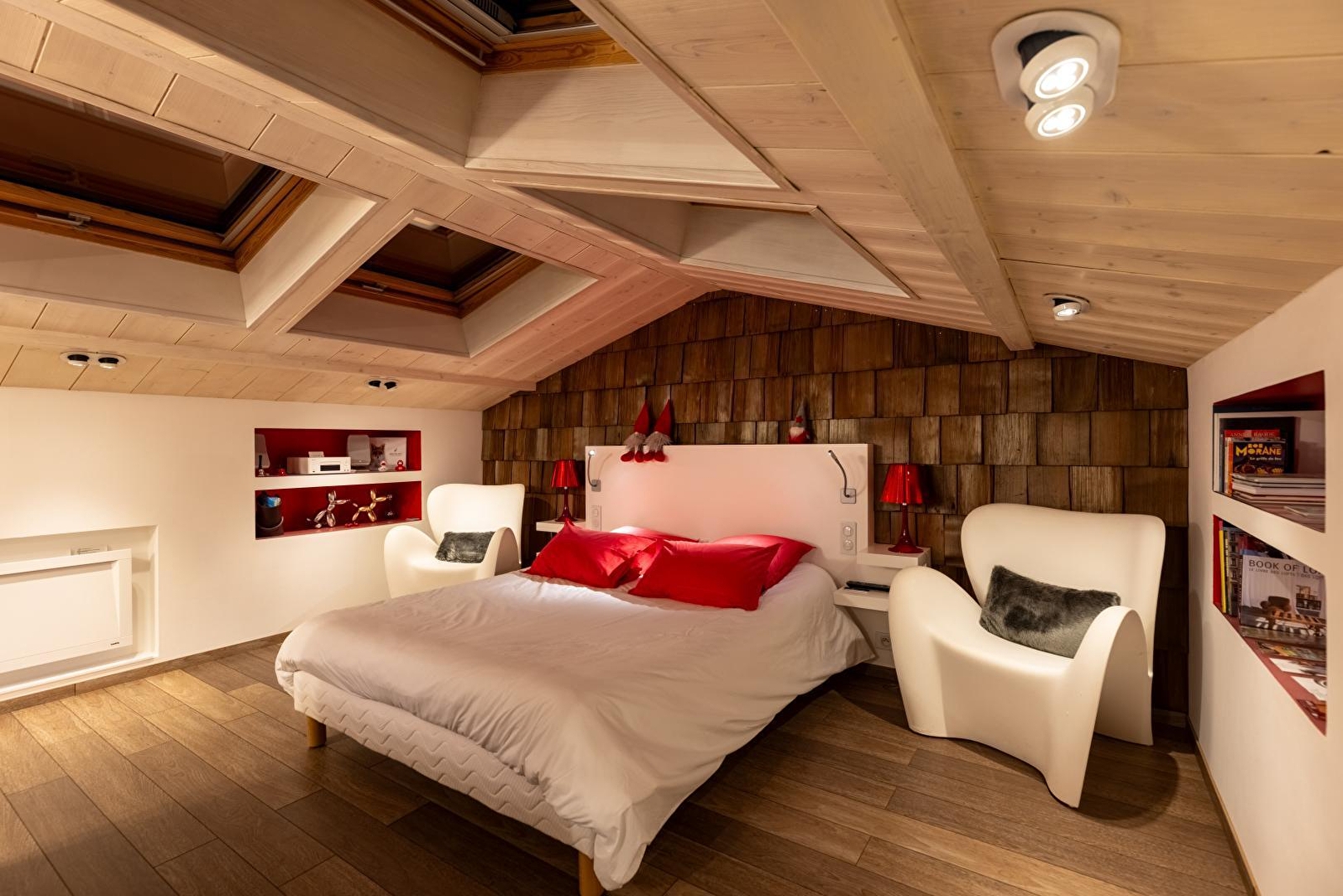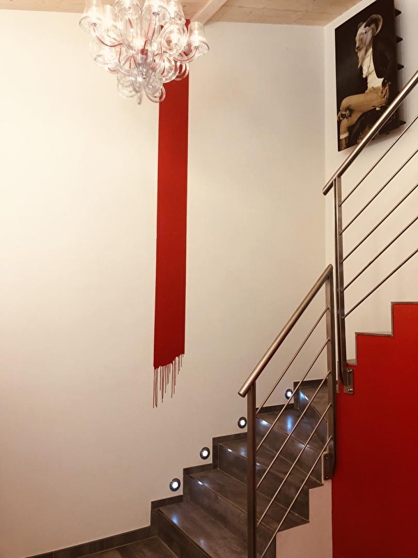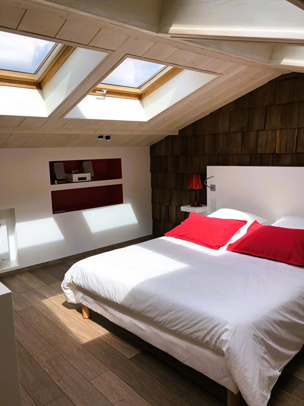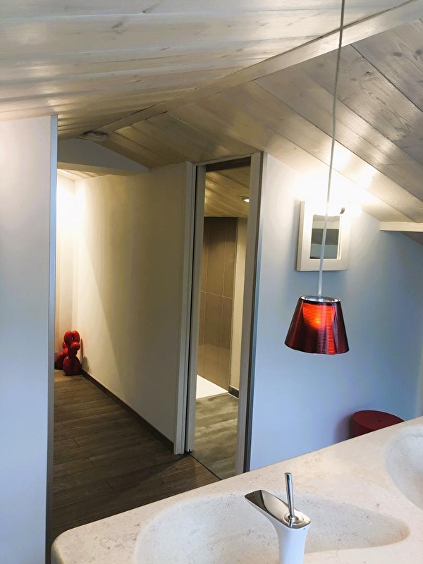 Duw de deur van Vanadium open en ontdek de keuken op de begane grond, uitgerust met inductiekookplaat en Siemens magnetron. Het rood zorgt voor een onmiddellijk contrast en zet de toon. Het is een plek die je zal opvallen en de originaliteit zal je niet ontgaan. In de nissen staan een Nespresso koffiezetapparaat, een Alessi waterkoker, een Denon luidspreker en andere kleine designobjecten, vaak in het rood. Zoals de Smeg koelkast die je avonden zal verfrissen. Vanuit de keuken kom je op het terras voor een moment van sereniteit, gesust door het gezang van de vogels (en een paar hinniken). Boven in de gîte wacht een bed van 160x200 cm op je in de slaapkamer, badend in natuurlijk licht dankzij de mooie openingen in het dak. In de winter word je verwarmd door een Everet dekbed en Carré Blanc beddengoed. De slaapkamer is van alle gemakken voorzien, met een dubbele wastafel aan het einde van het bed en een grote inloopdouche. Klik op een knop en er verschijnt als bij toverslag een tv: een HD-scherm van 55 inch met toegang tot Apple TV, Netflix en Canal+. Vanadium is prachtig ingericht met Fat Boy verlichtingsarmaturen en designerobjecten.